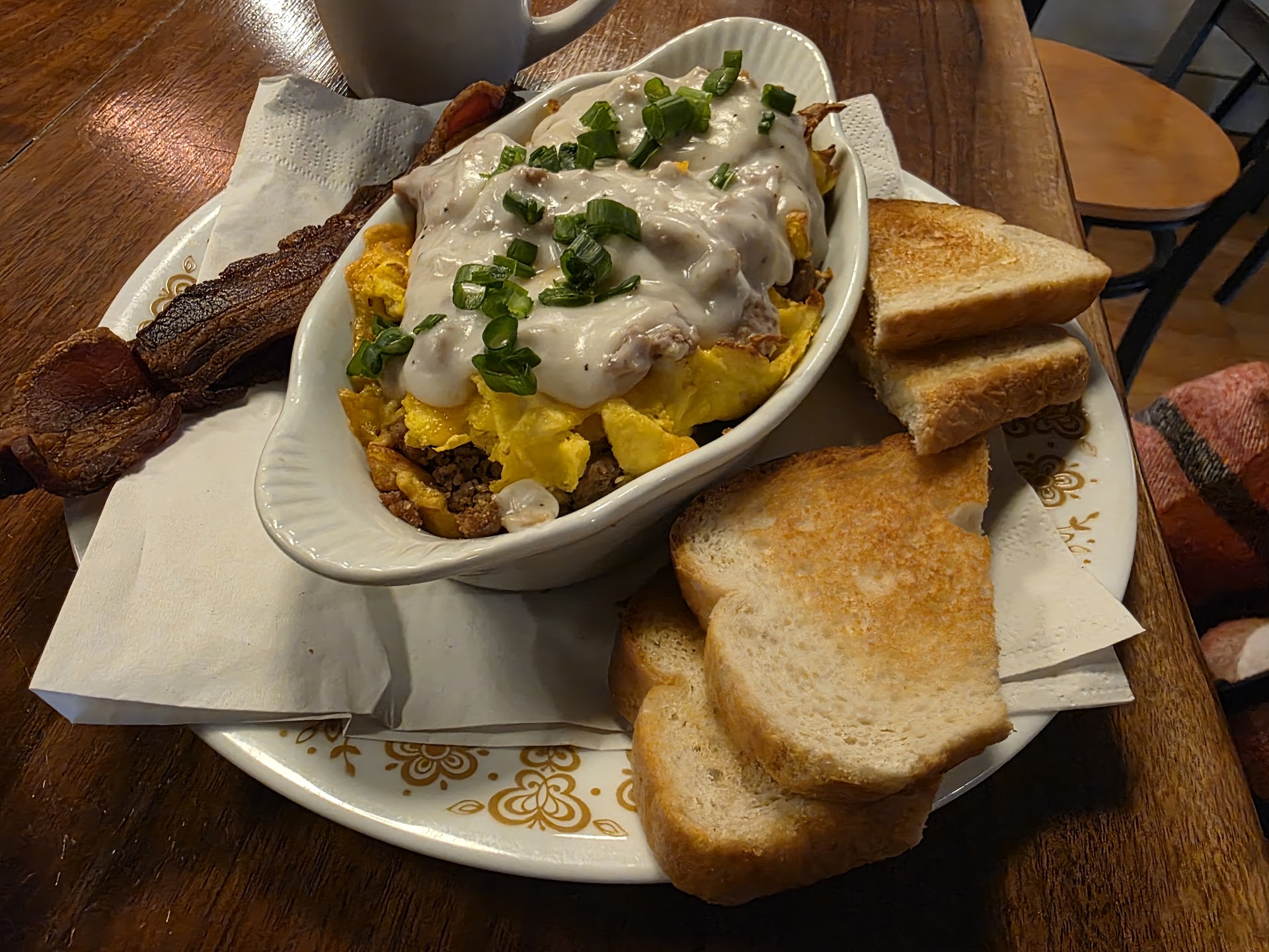 Poor Gen Z waitress (you could tell was in training) came back 2 separate times re my order. She initially told me Yes, they could baste eggs and Yes, English Muffin instead of toast, but they could not do either. NO BIG DEAL if they couldn't. Fixing breakfast is not Rocket Science and I'm Flexible. Just give me over easy and forget the toast (eggs, bacon and potatoes are plenty). She got confused (it happens) and thought I wanted to scratch the total order. When the socially impaired, rude Millennial owner (or manager) brought the food and mine was missing she handled poorly. She came off short and tried to question/finger point about the error. My food wasn't there, why speculate what happened? Apologize and move on. If you can't say sorry about the confusion, just put in a new order which she did. But right after proceeded to whisper for a while at the bar with the Gen Z waitress. What a lousy example for the employees. Made me feel like a heal and all I did was smile and say, that's OK, go ahead and put in a new order. Was the strangest behavior I've witnessed about a mix-up with an order. Just rude with the defensive...