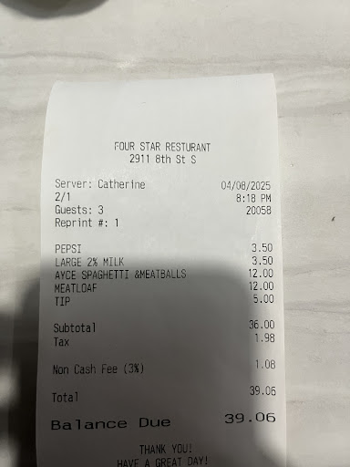 Read moreI am always very adamant to leave a tip, however, I did not this time. My wife and I and our two daughters ordered breakfast during the evening and it was overall just horrible. The veggie omelet had no cheese, was burnt, and had no taste anyway, even if it did have cheese. Who uses canned mushrooms at a restaurant? The hashbrowns seemed like they were doused in butter and tasted like other food which means they don't clean the grill. The pancakes tasted like bagged store bought batter mixed with water. My recommendations would be to downsize your menu so you can focus on making good food. There is probably 150 things on the menu, which means they specialize at nothing. I don't want to tear into the restaurant, I will say the staff was friendly. But, this restaurant could very badly use an overhaul and a visit from the food network-Restaurant Impossible staff. I had to give it 1 star just to make a comment, but it doesn't...
