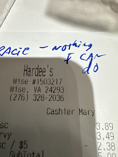 Ā Ā Ā Read moreJust got to experience Hardee's customer service and management interaction.. The young man missed the order all together. When placing order 1st time. After repeated order numerous times after that. Drive to window. $35.00 dollar order. We received 1 cheeseburger. Meal, I shorted a large fries. So another shorter women. Started to demand for a recipe ( Which the gentleman never gave us.) Then the shorter women said to us. And I quot " Let me see the brown bag. (Which we was not giving. We just received a plastic bag. But the young man who took order picked brown bag up and started to walk off. At that point I said the gentleman picked brown bag. Then all of a sudden the bag appears. Then asked about strawberry milkshake. We where told we had to go back and order milkshake again. So we do that. Pull around to pay and gave the same gentleman who took order $10.15. The shake was $5.15. Then didn't get the ,,$5 in change back. Had to sit in drive thru couple mine. Then had to yell at them to open window up. So 2 ladies disappeared. They went and counted the cash register. Before we got $5.00 back. Never have i been told i stole fries. And I lied about the $5.00. Sad shape the evening shift is here in coeburn. Wish they would have took better notes from breakfast crew. Ill not be stopping at that Hardee's after breakfast anymore. Whoever ownes the franchise should really think about different managers. I just tossed food in trash. Wasn't feeling brave enough to eat food nor did I have appetite after this interaction. When I asked for store number. Manger refused to give number. And told me to look for it online. This is person who is in charge. Then u had 2 or3 other employees outside next to...