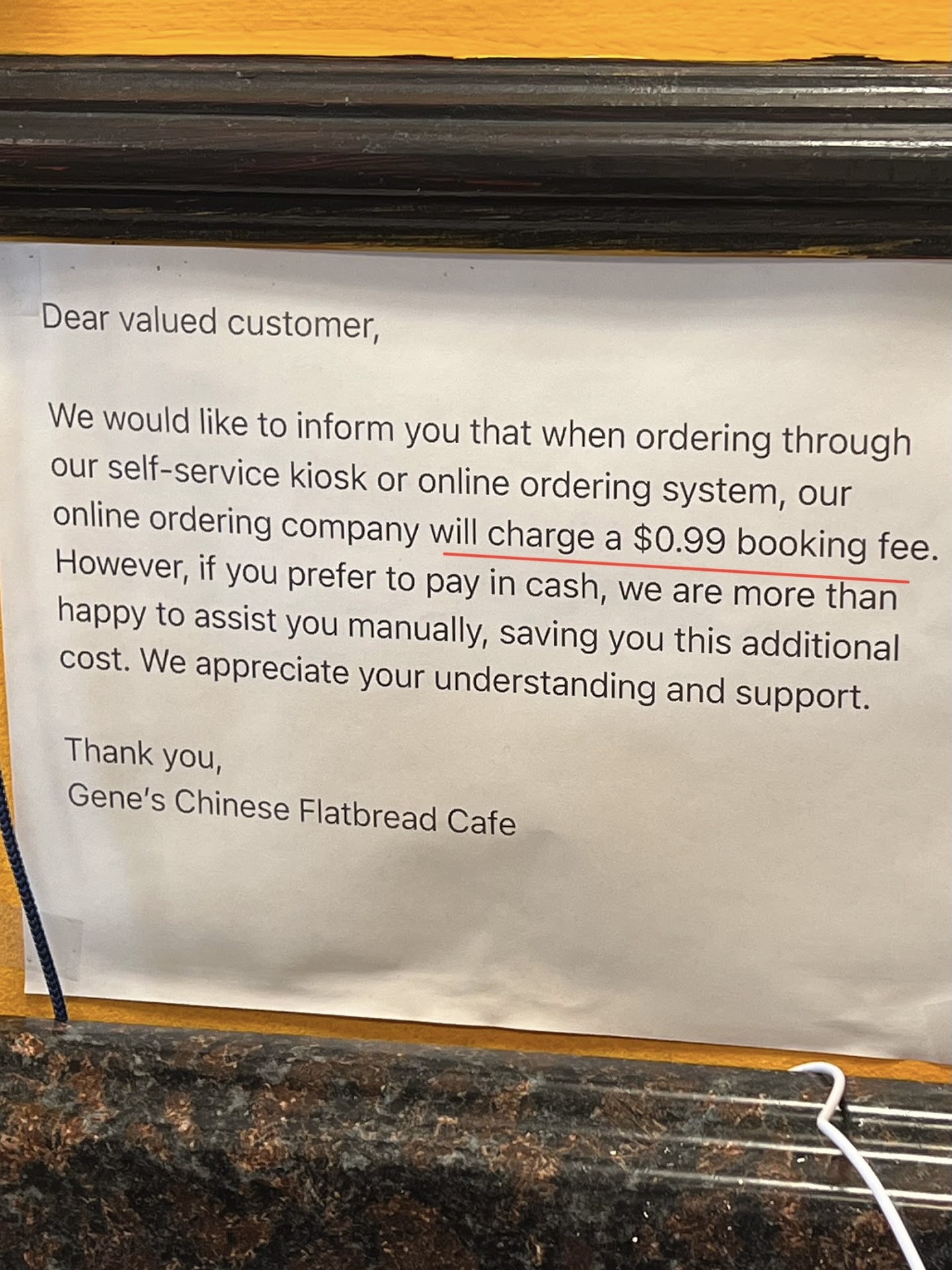 UNPLEASANT ATMOSPHERE: The floor is sticky (which is a bad sign), table was not wiped down. You will be charged 99c for ordering from their self-serving kiosk, or pay in cash if ordering with the server. It’s not about the charges, it just show how much they care about their customers.