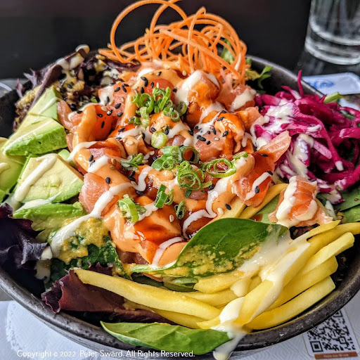 Lunch Spicy Salmon Poke Bowl ($11.95) at the newly opened @meetwoburn. "Base: Sushi rice & Spring mix, Come with avocado, mango, pickled purple cabbage, carrot. Choice of Protein. Sauce: Ginger Dressing, Sweet soy sauce & Mayo". I picked Spicy salmon as my protein. The salmon was fresh, and although it wasn't an abundance of fish, it was a good amount for the price. The spring mix and the other veggies were plentiful with a pleasant dressing. The sushi rice was lightly seasoned but was cold; however, there was a good amount of it—a delightful light lunch. Not impressed by the rest of the lunch menu.