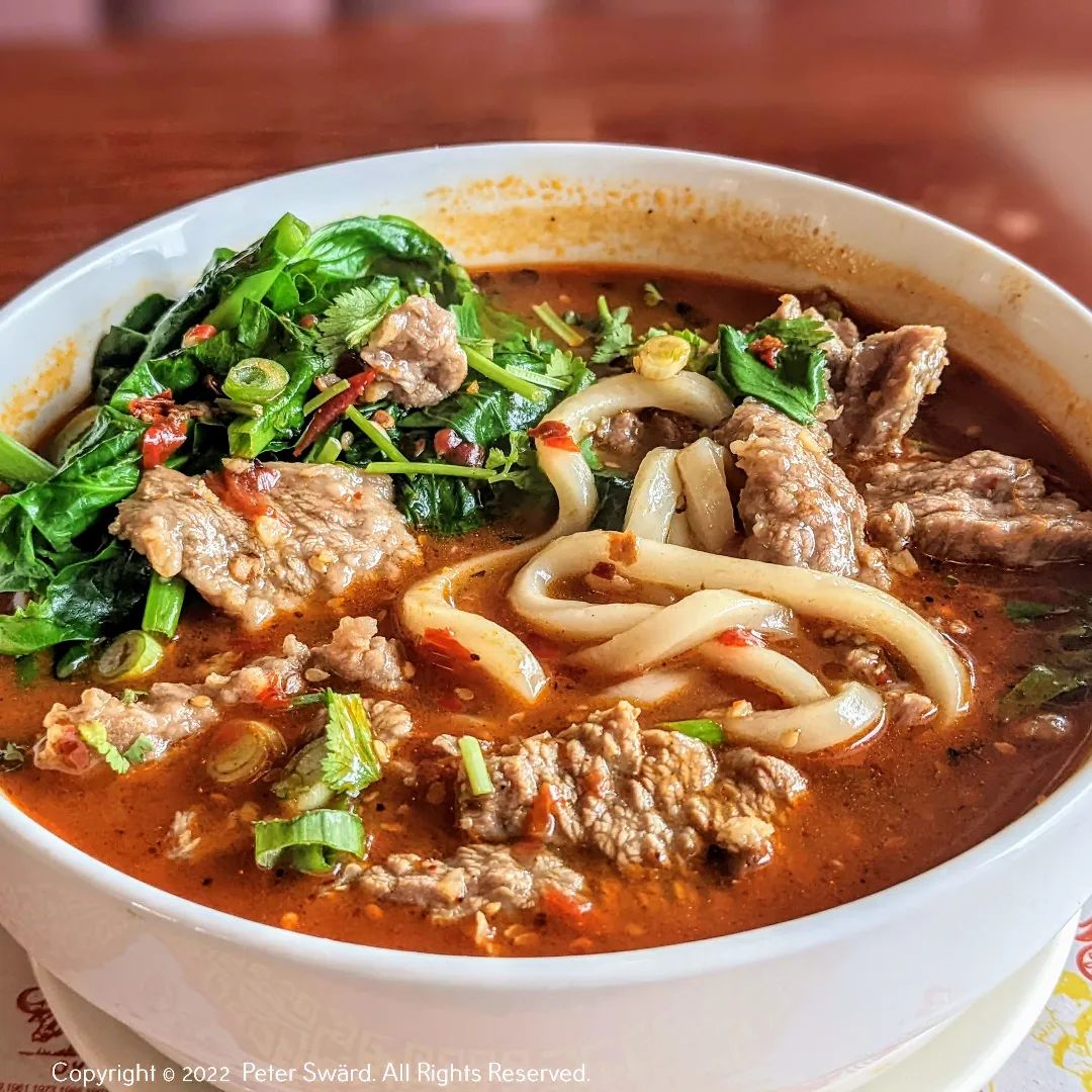 Sichuan Spicy Beef Udon Noodle Soup ($12.95) at @peppercornhouse_ma. Asking for it extra spicy gave me what I would call spicy. The broth was excellent and it was mala. The beef was of good quality, not beef with icky bits that you get in the Taiwanese places. The green stuff was cooked but still had texture. I'm a big fan of udon noodles and really enjoyed these. It was a bit of a fight to eat them since they were really long. They have an really extensive lunch menu.