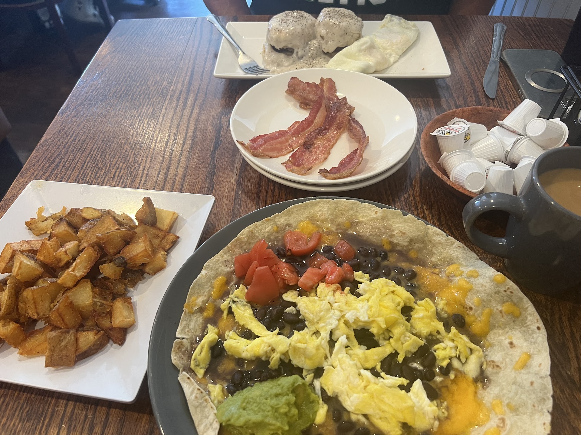 I had a classic breakfast. Two scrambled eggs, two sausages, rye toast, and hash browns.