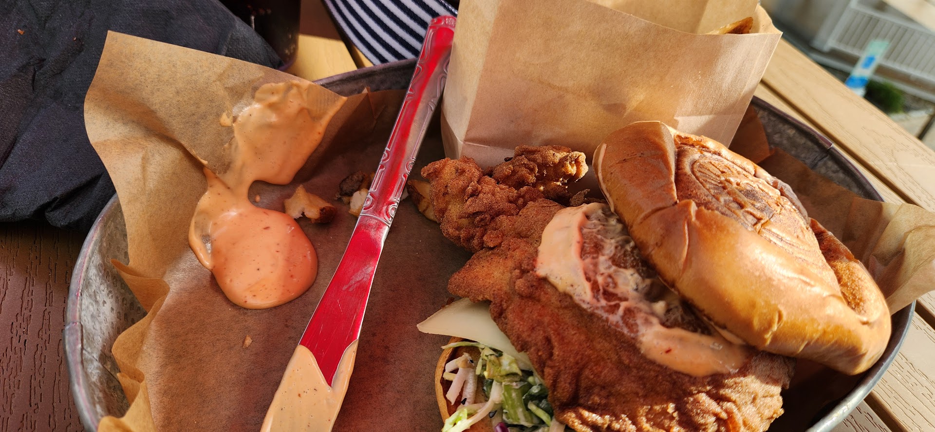 The bad: They opened too soon because they had a lack of common items a restaurant should have like salt and pepper shakers and coffee pots. Our waitress had to go downstairs to get our coffee which she made a point to tell us she would have to do that…I guess she was hoping we would order something else to drink???? Then we wanted salt for the fries and she had to search for a free set on other tables saying they didn’t have enough salt and pepper shakers. Not kidding here!!! I have never seen that before in 50+ years of dining out.