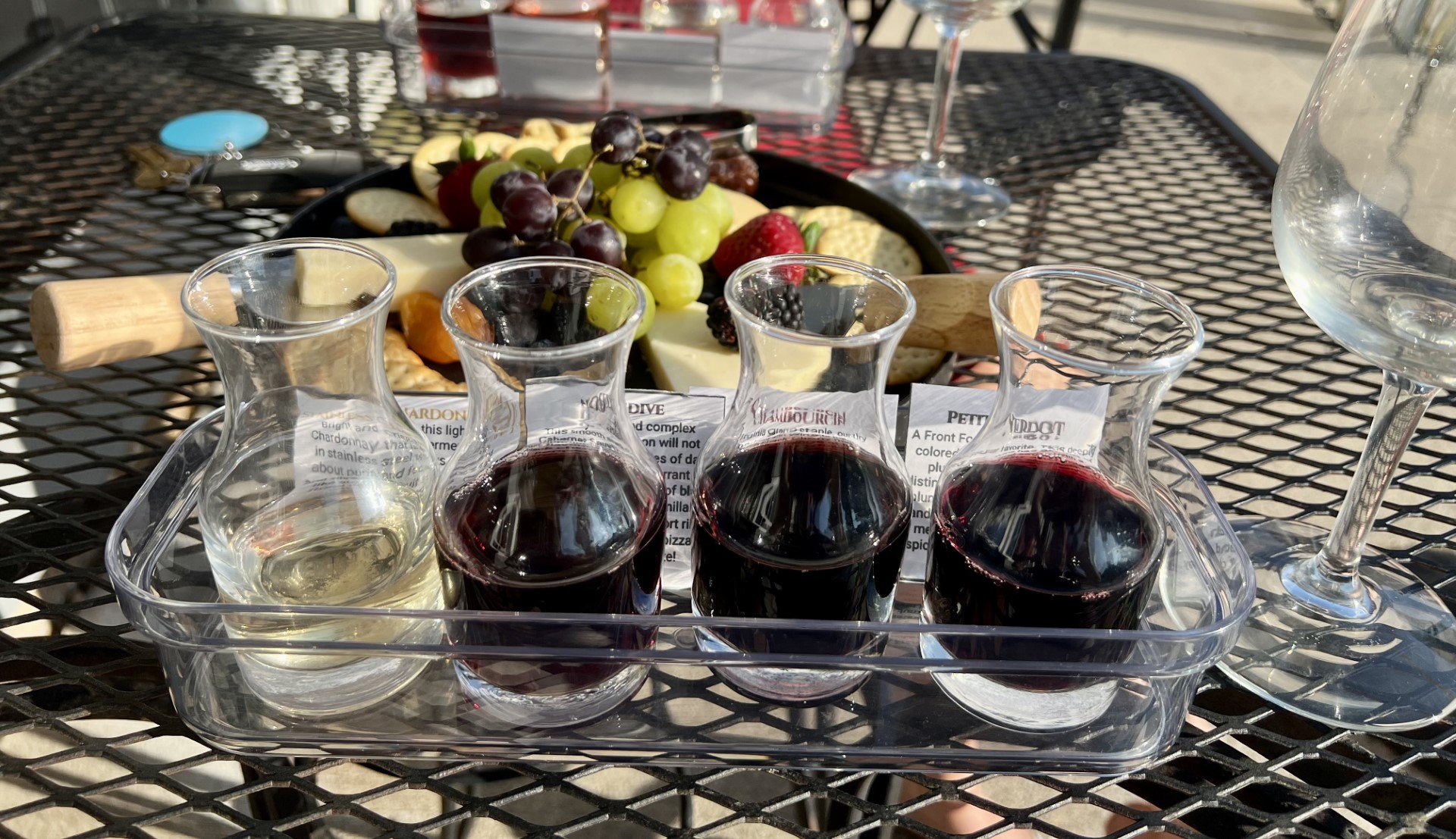 Whether you're a red, white, or rosé lover, you'll find a selection to suit your taste buds. I didn’t get a chance to try, but the wine slushies looked delicious. I appreciated the option to sample wines by the flight, tasting, or by the glass. In addition, they have several food options to pair with your wine. During my visit, I decided to try the fruit and cheese plate, and it was a wonderful pairing with the wine.