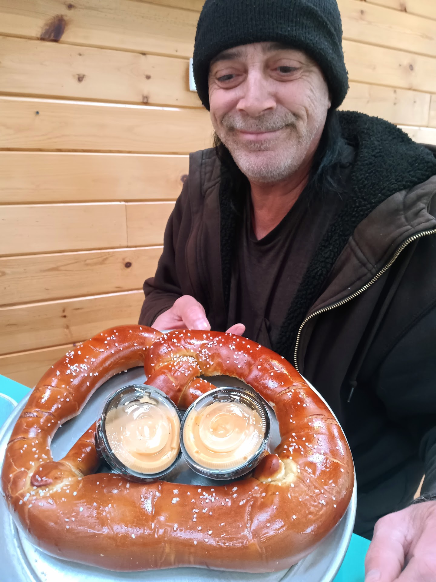 Was here before with Nate for pizza, and this time I brought Joe to split a chicken wrap and this gigantic homemade pretzel! Mike, the manager, remembered me from last time and is just so welcoming and personable to everyone! Palm trees, flamingo and bright pink and pastel decor throughout gives the feeling of being at the beach although the only water around today was the spring rain. This pretzel we shared was accompanied with a spicy brown German mustard and delicious beer cheese that I could have eaten with a spoon on its own! I'm not much of a bread or pretzel eater, but this was fabulous! They have a nice little pizza and salad buffet on Sundays from noon to four that I would like to try, as well as some other weekly specials. Quite a few people dining inside today, although it wasn't over crowded. They have TVs, gaming machines and a nice festive deck for outdoor seating. Try this pretzel and order some...