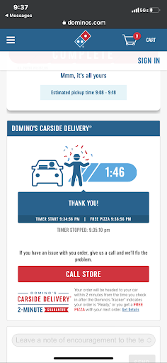 I ordered online to discover there was no delivery available at this location but instead CarSide pick-up. Since the site explicitly stated this I was happy to drive there and wait for my food to be brought out to me as was already determined. I arrived at 9:34 sent the “Here” text and was instructed to put on my hazards on and wait for delivery within 2 mins. At 9:35 It showed as having been delivered to my vehicle. Understanding it was late I extended more grace and waited until 9:40 for someone to come out.