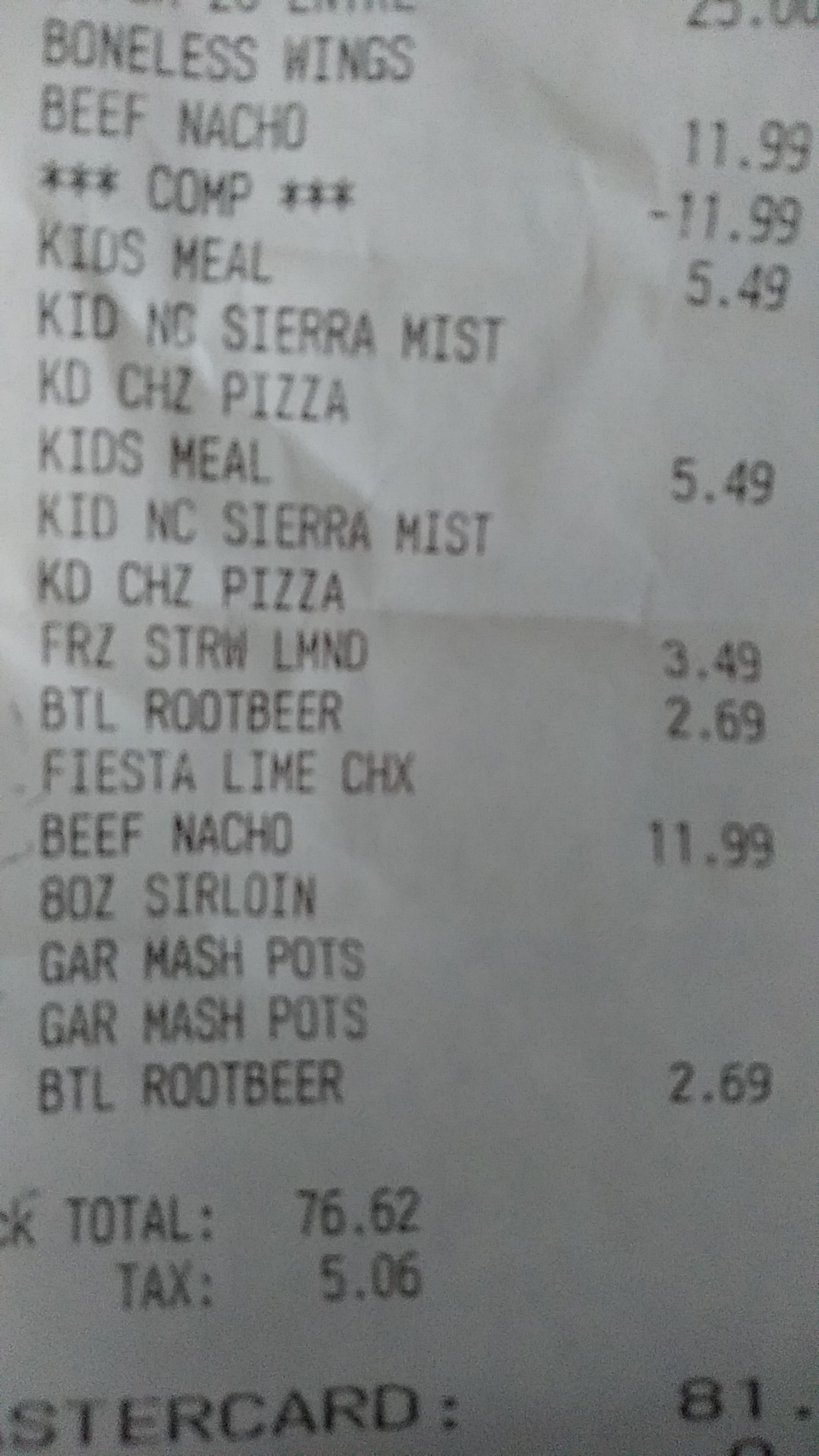 Read moreVery poor experience. We should have seen the warning signs from the beginning and just left... The restaurant was fairly empty (maybe had about 5 tables filled); however, there were tons of staff. We got seated in a booth; we couldn't even sit in the booth because the seats were so far pushed towards the table, maybe a toddler could have fit. We had to push the seats back ourselves without any assistance (talk about embarrassing!). We ordered our food pretty quickly and received drinks. This is where things go wrong because the waitress didn't write down our order... We received some of our food, (my main entree, my salad, and friends 3 for $12 appetizers). We ordered the chips and queso appetizer that didn't even come until 6-10 minutes later and it was wrong! It came out with a mound of ground beef when we asked for just chips and queso because we can't eat ground beef. She took it back. I thought you were supposed to receive appetizers BEFORE your meal?!? Not only that, but my salad too! My Caesar salad had no dressing so I had to ask for dressing which was a little ridiculous. My sandwich was also covered in barbeque sauce when I specifically said no sauce of any kind please. My friend ordered the 3 for $12 (he chose a house salad, mozzarella sticks, and boneless BBQ wings). The ranch he received was completely frozen, making it inedible. The salad had more tomatoes than lettuce (also requested no tomato on the salad). Wings were lukewarm at best, not necessarily an issue there other than he couldn't use ranch with the wings. Queso came back out approximately another 10 mins down the line and by this time we had already finished most of our salads and other food. We also only received 1 refill on our drinks the entire time. Again, restaurant was not busy, so no excuse for this experience...also was overcharged on the bill for 2 things of queso and had to have them correct it. Very very very poor experience....