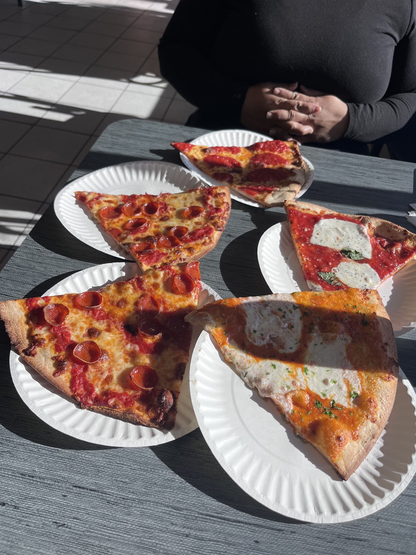 Atmosphere is very good. Loved the old-timey music, the cramped kitchen space, watching the dough folded out, looking at the beautiful pizzas on display, the seating was nice with no uneven tables and creaky chairs, photo's of generic NYC in sepia filter adorning the walls, and a eye-catching wall of proudly displayed currency with "good luck!" written on it.