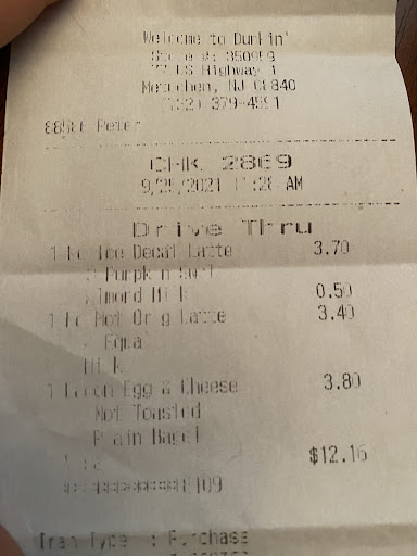 A bit overdue. Two weeks ago, as I was driving from New York to Maryland, and I stopped in New Jersey at this Dunkin' Donuts to get some coffee. I went through the drive-through as there was no line I figured I could just get my coffee quick and get back on the road ASAP. As the lady who was taking my order comes over the intercom to receive my order she can't stop laughing like a fool, because some guy inside the restaurant was flirting with her. So much so that I was not sure if she even got my water right even though it was just coffee. On top of that, she's talking to this guy, and attempting to take my order at the same time.