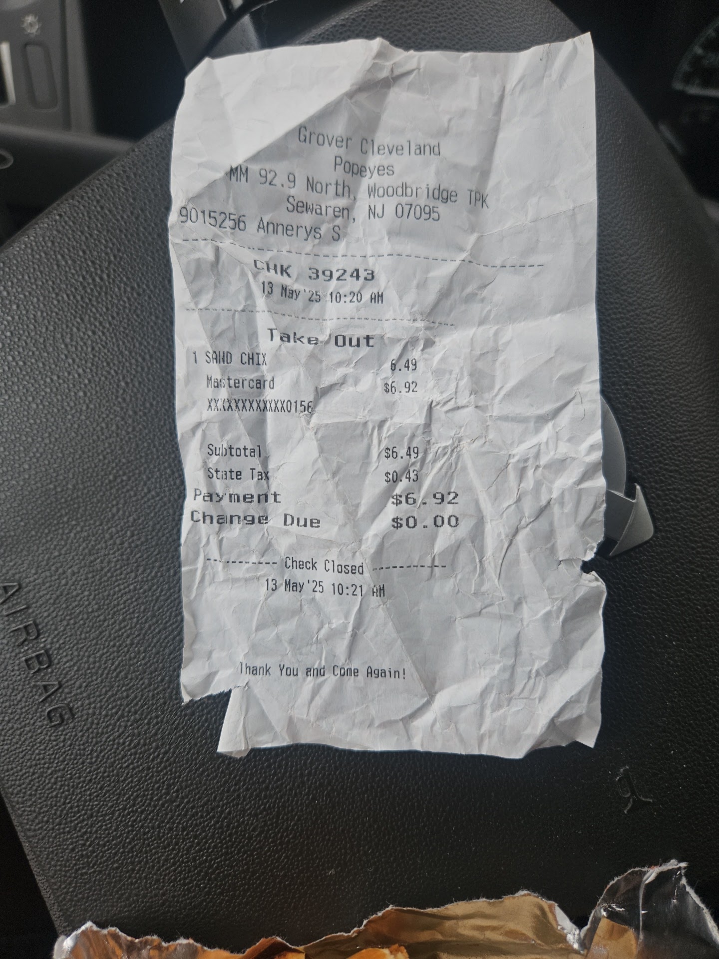 Read moreHello Grover Cleveland Popeyes . I and my friend went to this location in 21 April 2023 at 4:17pm.I was from south California to visit NJ. And my kids wanted to eat blackend tender from that location . The cashier was tall healthy Spanish girl. She replied that they don’t sell naked tender. I asked her that if the tender was run out or Popeyes stop selling this item. She replied with aggressive voice that “our cook(kitchen guy) doesn’t know how to cook naked tender that is why we don’t sell it here”. I was soo disappointed in front of my friend. We didn’t expect this behavior from her . Then we wanted to have some mild dark and white meat . She told me only Spicy is available. We didn’t have any other choice because kids was hungry. So we had to buy those spice chiken from your location.