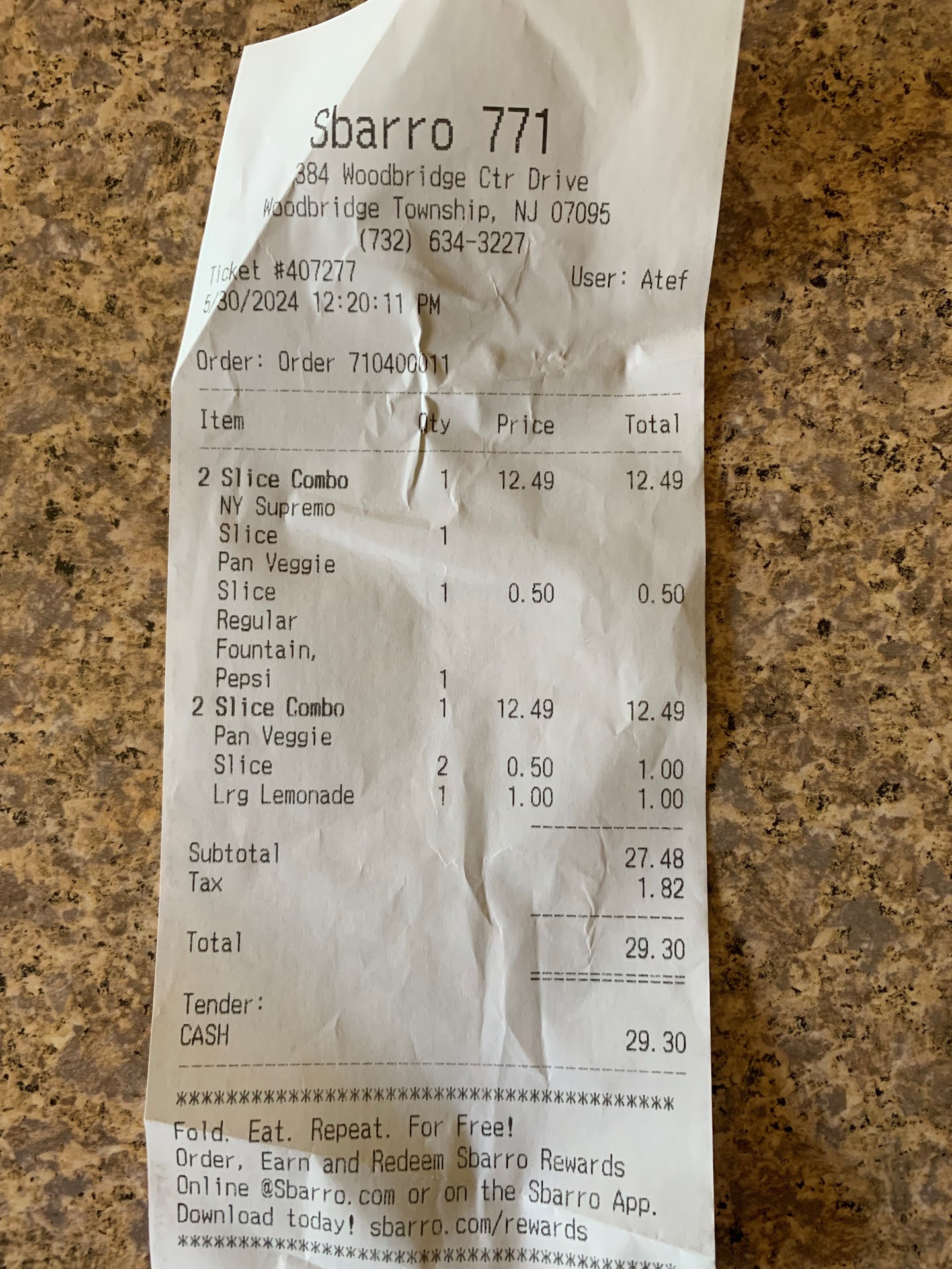Read moreThis afternoon, I met a friend for lunch at Woodbridge Center Mall Sbarro. Both of us chose the "2 Slice Combo," which includes a beverage, for $12.49. With New Jersey sales tax, that comes to $26.63, yet Sbarro charged us $29.30. The counter clerk read my expression correctly and, before I could ask, he explained there were extra charges for our pan veggie slices and lemonade. Bait and switch? I saw nothing posted about certain pizza or drink selections costing more.