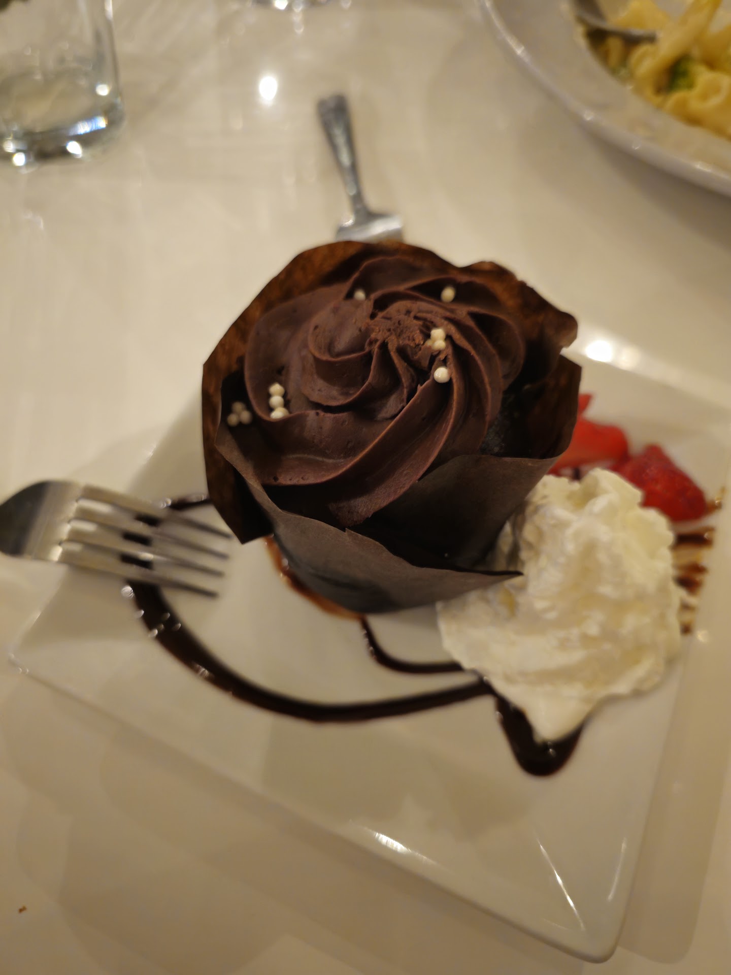 We started out with the cheese bread and marinara dip and for dinner I ordered the pesto pasta and my wife the alfredo penne. Both dishes with their handmade noodles were delicious, we ate every bite. As it was my birthday dinner the waitress gave me a chocolate cupcake that was mid at best. I was greatful as I didn't expect it but it seemed very dry and bland. I had a little bit of bourbon before the main course and had a glass of wine with the pasta. I had asked the waitress for a recommendation and she chose well. The food gets a 5 star