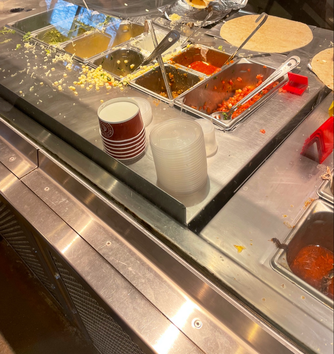 Onto the next subject, The filth: I worked for several years as a short order cook, and NONE of my bosses would let me keep my station as downright filthy as they keep their PUBLIC FACING work stations. There is always old food on the counters, usually piles of meatjuice, sour cream, and bean residue . The floors are an outright safety hazard, and are caked with trampled over pieces of food. Garbage cans are ALWAYS overflowing onto the floor.
