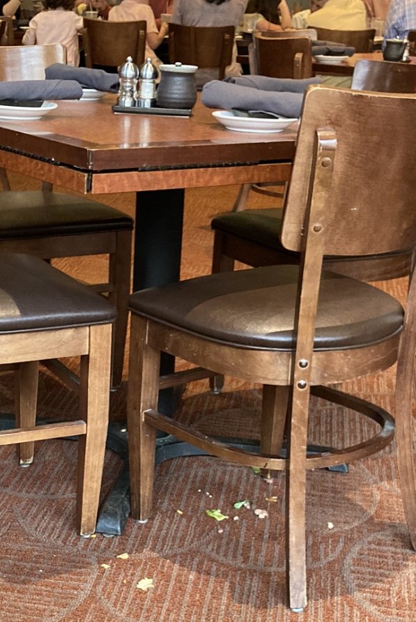 Problem 3: The facility. This restaurant was not clean. There was food all over the floor at the table next to our booth. We watched an employee clean and re-set the table. We were sure they would come back to clean up the floor, but this did not happen, at least not for the hour we were there. Also, the appetizer plates at our table had bits of food crusted on them. I opened my napkin (with silverware enclosed) and crumbs of food fell onto my lap. Never have I ever had someone else's crumbs fall out of a "clean" cloth napkin. This is a health hazard and immediately dampened both my and my partner's appetites. Lastly, there were no automatic push plates on the entrance doors to this restaurant. Someone with a wheelchair would have trouble getting in alone. Luckily I had my partner to open the door for me and my walker.