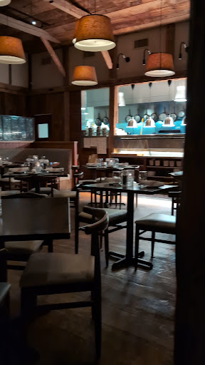 The restaurantâs exterior is a barn-like structure. The wooden interior is very spacious, with a vaulted ceiling supported by wooden beams, and illuminated by string lights and hanging lamps throughout the dining area. From where we were sitting, we had a glimpse into the kitchen. The establishment is very clean and inviting.