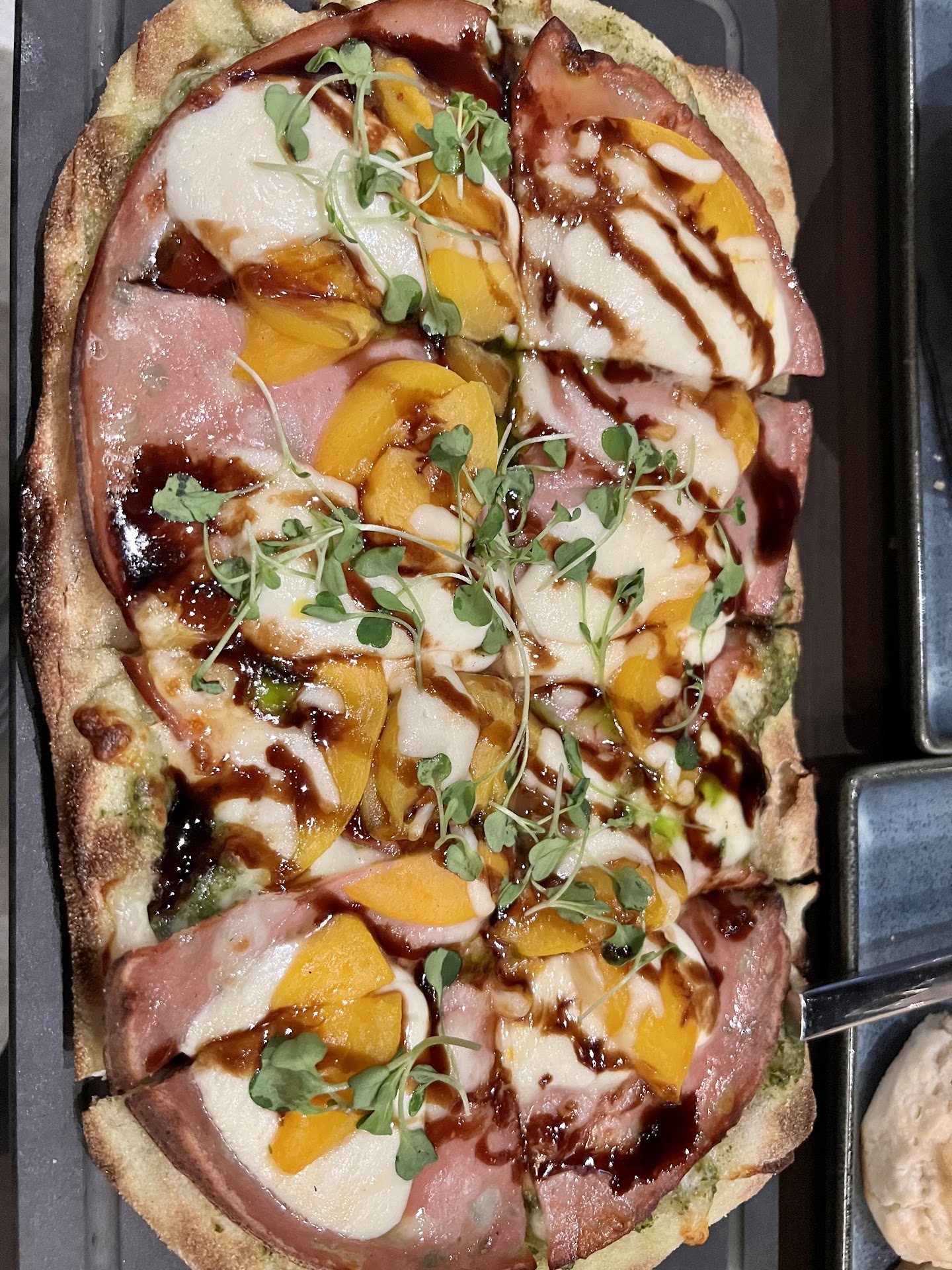 Bolo Peach Flatbread: I ate one piece and had to stop because I felt sick. I have never seen such an oily flatbread. It was literally seeping out of the crust. The oil from the pesto and the layer of cheese under the top mozzarella overwhelmed the other ingredients and became the only flavor. The whole plate was a pool of oil. The bites with peach were more tolerable, but barely.