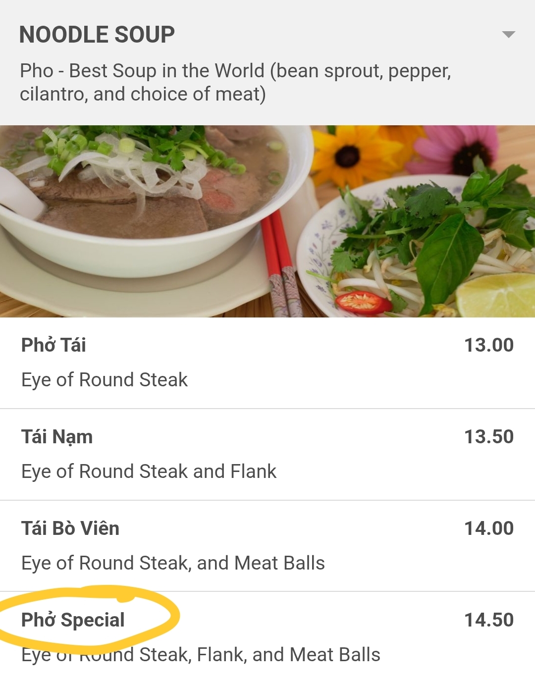 Pho-TÔi Nam Bò Viên -Eye of Round Steak, Flank, and Meat Balls. It was served in a small bowl, the smallest bowl that I've ever seen Pho being served in. It was filled to the brim which made it very difficult to add your ingredients. Which, once again we had to request fish sauce since it was not on the table. Most places bring out the fish sauce, sugar, etc. when they serve Pho. They do not have tripe or tendon on the Pho menu which was also disappointing. This was the worst Pho that my Cambodian boyfriend and myself have ever had. The price of $14.50 is very reasonable for Pho, not this one.