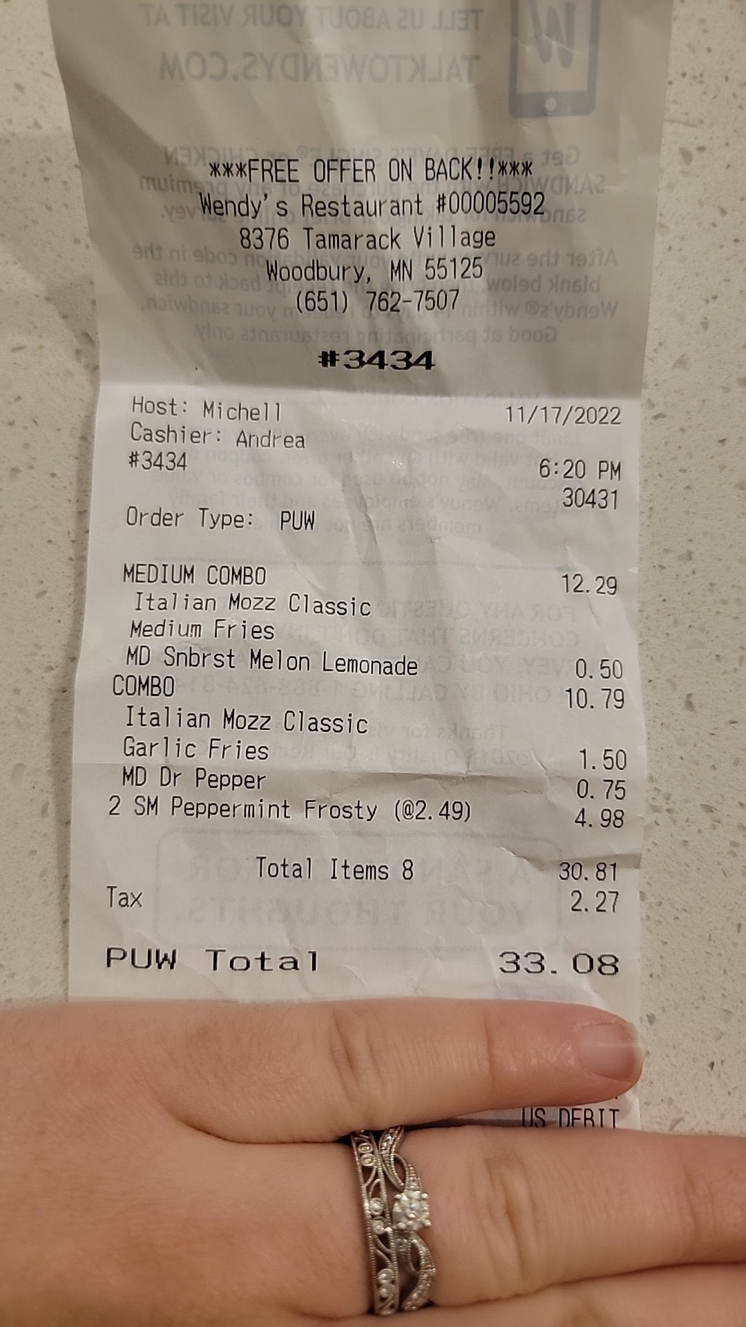 Read moreJanuary 25th I tried to eat at the Wendy's in Woodbury for the second time with my boyfriend and it was horrible. After standing at the counter for 5 minutes without even so much as a "hello" or "we'll be right with you", watching the manager stuffing her face with food in eyesight, seeing same manager along with another manager and a crew member standing in the back in plain eyesight looking at a phone giggling, the manager coming up to the Register and ignoring the comment that was made about waiting so long to have our order taken, then after the comment was repeated claiming that she could "help us now" we decided to just leave. As we turn to leave she busts out laughing because apparently it's funny to treat customers that way. The first time we were there was no better, bathrooms were nasty and food was gross. Don't waste your time going there unless you like rude employees and managers that laugh...