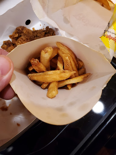 Ā Ā Ā Read moreI get there around lunch time today 11:40ish 8/8/2024 and order the 5 piece strip mean with fries and a sweet tea. They were not busy, and only one car (blue BMW) in line infront of me. The worker at the Intercom says they need to cook the strips and there will be a 5 minute wait for them. I find that odd at lunch time that they have no lunch food cooked but proceed to pull up and pay. I'm asked to park, which I do. Ten minutes later a lady carrying what appears to be 6 boxes of strip meals and a bag of food comes out, hands me a box after confirming I ordered the 5 piece strip meal and fries, and walks off. I drive all the way back to work and find a 3 piece strip meal of undersized and overcooked strips, and a small order of dirty (should be called nasty) rice. Usually I wouldn't make a huge deal out of it if it wasn't for the fact that the price difference between the two meals is significant and the dirty rice looked and tasted like it was cooked in the dirty dish water from the night before. It's not hard to count to five and make sure fries are In a box before handing someone their meal, especially after you charged them for it. Children in 1st grade know how...