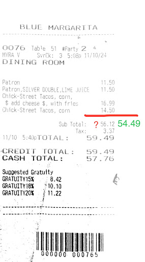 Read moreIf we didn't get a great service I would of gave the blue margarita a 1 star. Kudos to you waiter for providing such a pleasant experience last night. Here's what I felt flawed my experience at the blue margarita, so just like any other Mexican restaurant you start off with the classic chips and salsa which is always a greatly received tradition but the salsa almost tasted Italian Oregano and basil must of been in the blend ; an unpleasant surprise to my palette but I wasn't going to let something so minor base my opinion on the rest of meal. I look at the menu and notice the prices are higher than I'm use to for Mexican food. I ordered a burrito, it sounded simple enough and hopefully would be an awesome choice(I was wrong) also for a 1.50 more you can get cheese on your burrito so I added it. the protein choices were ground beef, chunked beef, chicken, or pork I was in the mood for steak, I picked the chunky beef hoping it was steak . we get our plates not long after we order, in the center were 3 skinny rolled up burritos to left was rice and to the right was the beans. I took my first bite and to my surprise the chunky beef was not steak but pot roast. I've never tried stew beef on a burrito before it wasn't so bad but the meat was so juicy it made my tortilla soggy which I didn't want. Not only that but stew beef is a cheaper cut of the cow. For a little bit more they could of used the stir fry meat or the fondue chunks which are also cheap but it's actual steak. The cheese on the burrito was mozzarella, it was thick and stringy and had no place on my plate. Overall disappointed in the food you pay premium price for food that is cheap to make and it tastes like a weird mix of Italian and Mexican. We had a great server last night and I really...