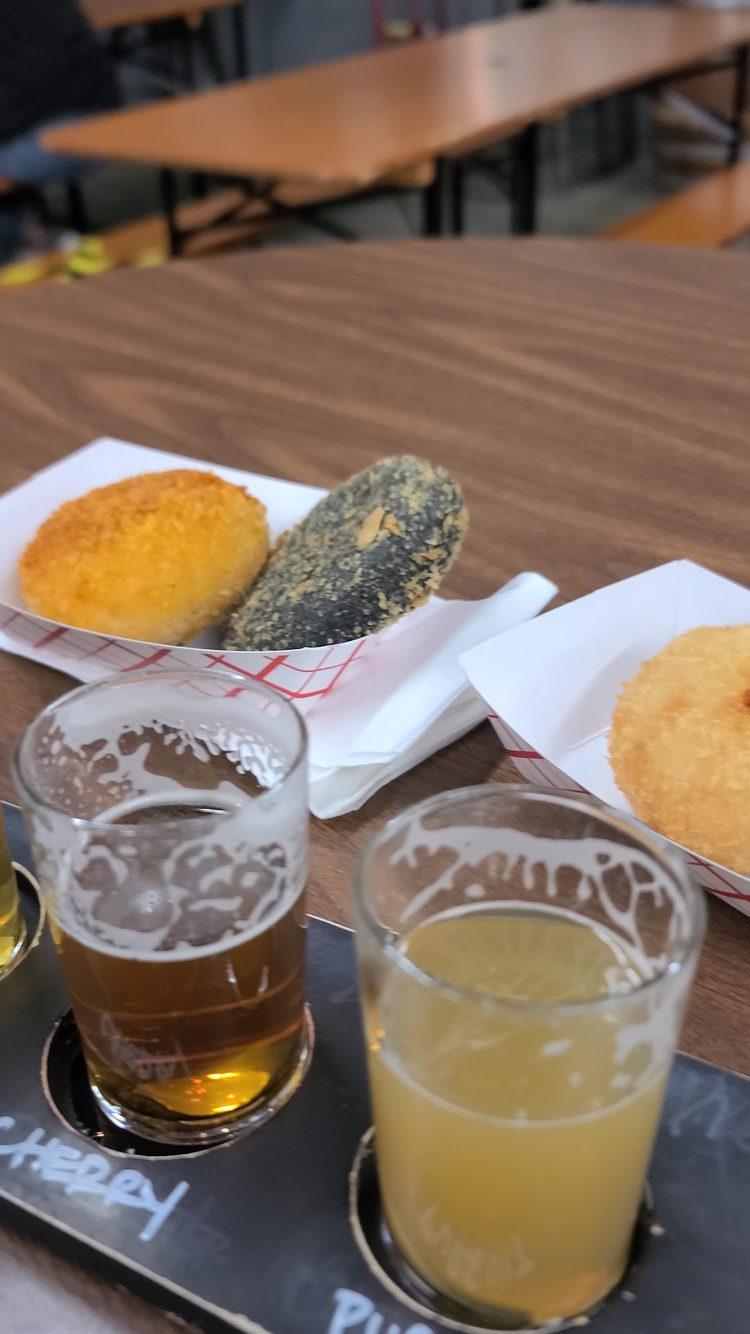 Read moreService is a 5 star, friendly and willing to help you discover the beer you want. Food is unique, we had a salmon pretzel and a deep fried hot dog. The salmon pretzel was a bit of a let down because I couldn't taste the salmon flavor, which is sprinkled on top. The pretzel was soft and well made but fairly small. The deep fried hot dog was a small piece of sausage packed inside a fluffy pastry fried with panko bread crumbs from what I could tell. Best way to describe it would be maybe a mix of a churro and a corn dog. I enjoyed this a lot but I wish there was a thicker sausage in it.