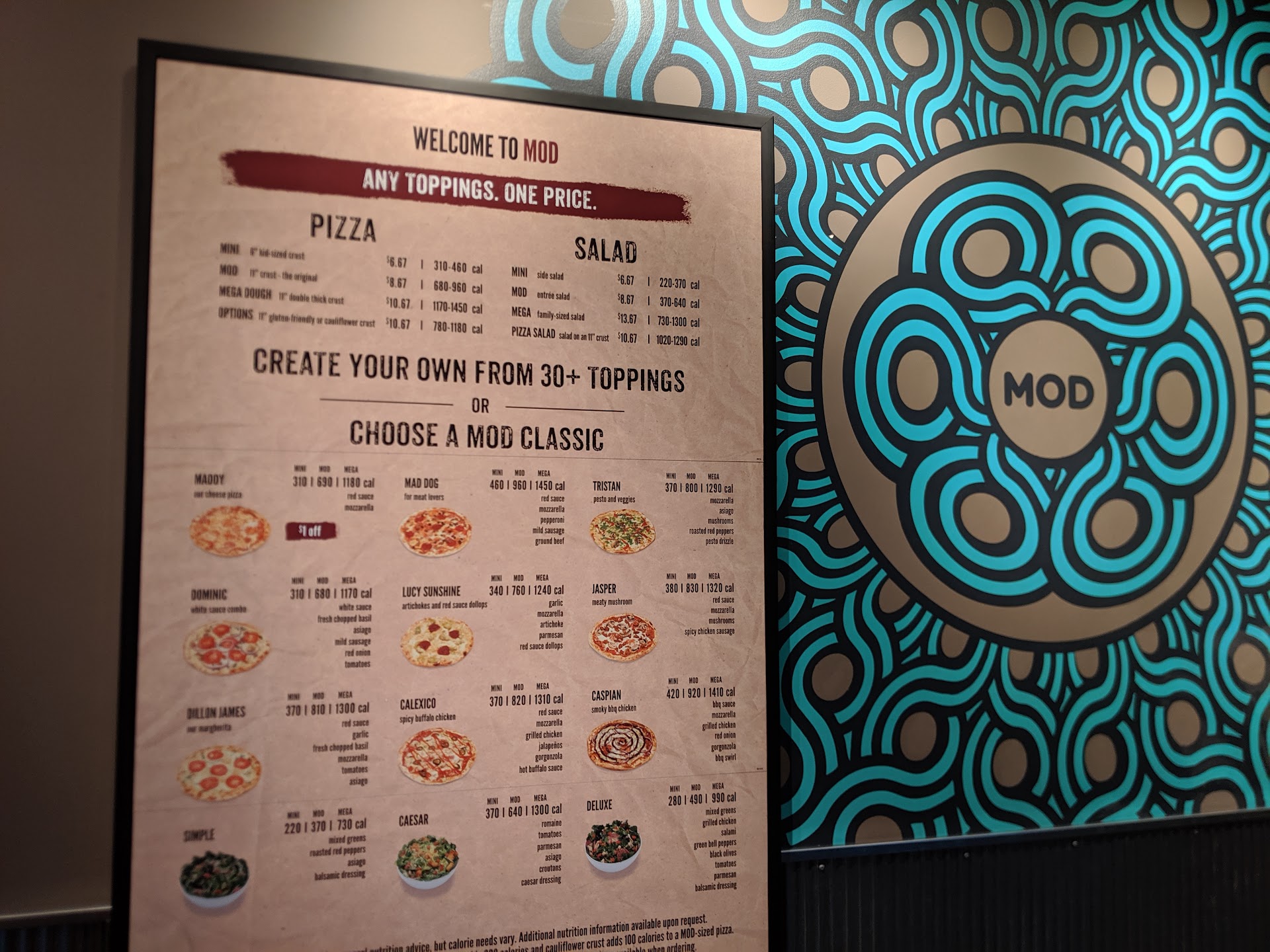One of the strangest visits to a Mod pizza. Food was ok, mostly what is expected. I would say we both agreed the sauce or dough was bland, overall bland despite the ingredients were there. Not anyone's fault, probably Mods ingredient sourcing? So I struggle to say this, but there is so much room for improvement as far as cleanliness: first impression: clean the oily handprints covering front doors throughout the day, clean the glass food covering throughout the day, keep your working area clean for the next guest's food, clean the restrooms, owner repair the restrooms, install a new door handle on the restroom, clean the tabletops (instead of brushing debris off). Clean trash & food off the floor from the previous messy careless guests (come on folks clean up after yourself & kids). The crew did ok, thier body language tells me they don't want to be there, or they don't like eachother, they can't work as a team, this contibuted to an off atmosphere. Customer service is a rough job at times, I get it, ive been there for years. Enthusiasm, cheerfulness, a smile, greetings, a freindly attitude...anything...goes a really long way to help this. Good leadership can make it a lot better. Cleanliness though....I've been in cleaner high school cafeterias. Also. No upbeat music, silent. The dining area was really cold, and I like it cold, but it was too cold, we both had to wear coats, family across from us said the same thing, really cold. Maybe the crew runs hot from the oven, so they cranked AC? Unfortunately we both agreed we wouldn't go back, every other time I went to a Mod Pizza in other locations it was a great time. First & last time here. Sorry guys, lots of room to improve, & i hope this helps somebody kick it in gear to...
