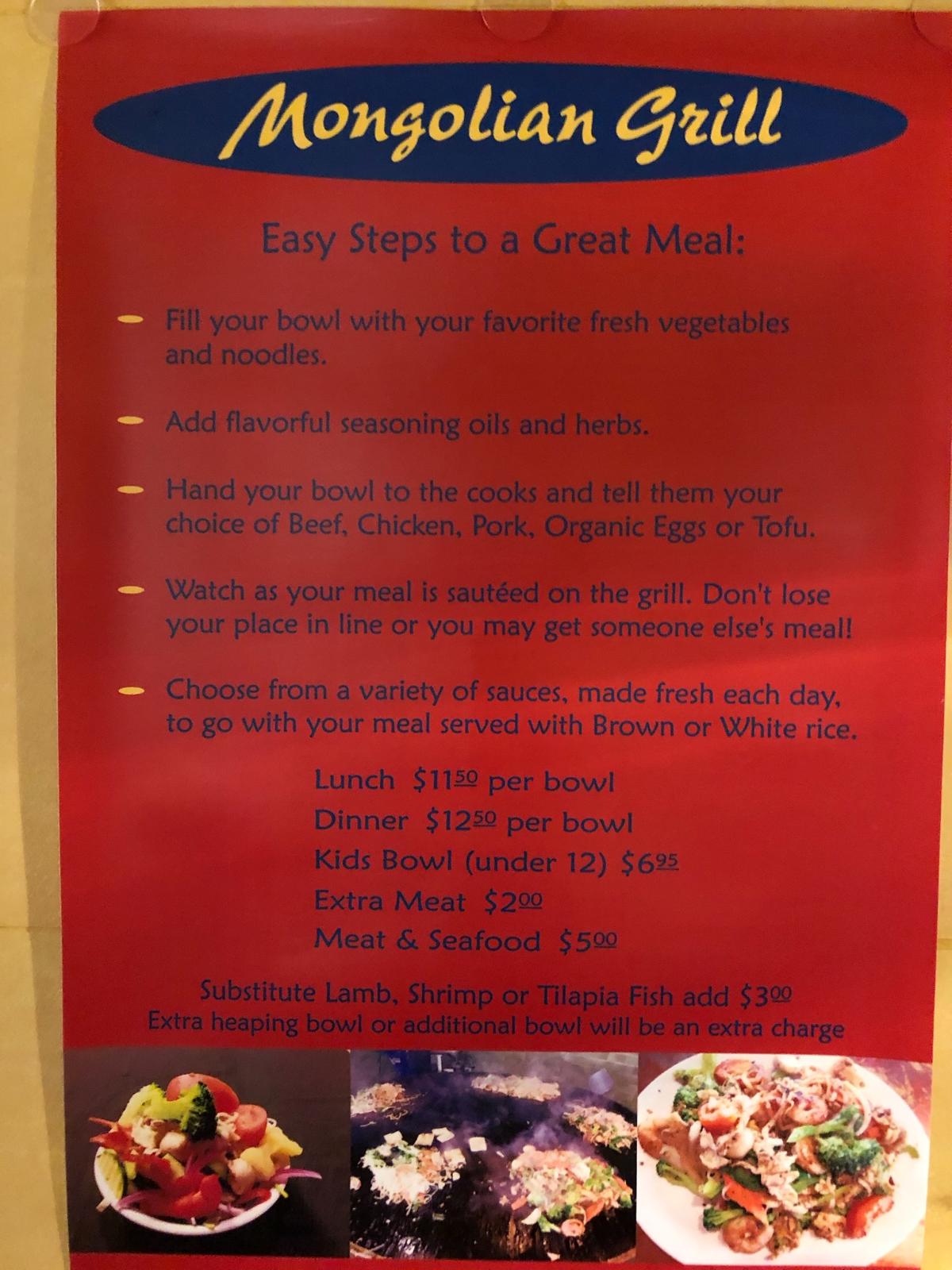 Read moreNot your regular Mongolian grill restaurant. I met up with a friend who told me that she got there a few minutes before I did. We looked around and realized this wasn't what we expected. Standing there looking and trying to figure out how to navigate their process someone finally asked if we were new to the restaurant. She was very happy to share with us where the bowls were, that we'd order our protein when we gave them our bowls and could pick what sauce at the end. There is a small sign above the bowls that tells you what you do. I've included a pic of the sign. Be careful how full you fill your bowl, the sign says you'll be charged more if the bowl is too full but no where does it say how much you'll be charged. They have an example bowl of an appropriate serving. You get to choose one protein and can add more for a charge. You select a sauce after you dish is plated. They have premade sauces and some of them are unexpected. I got a couple of the sauces on the side so I could mix them together. I liked that you can get brown or white rice.