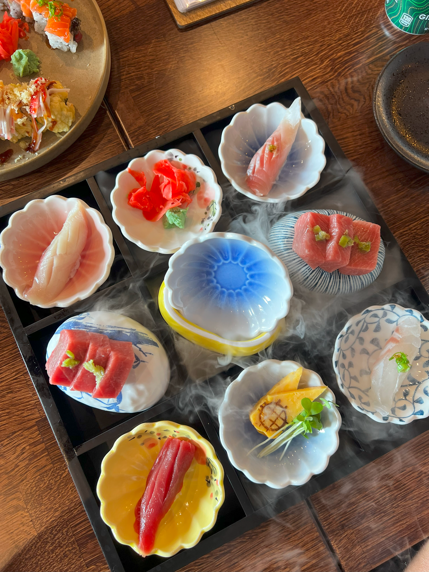 Menu Highlights Omakase: Beautifully presented with dry ice and elegant bowls, the $46 Sushi and Sashimi Omakase included 4 pieces of sushi, 6 small chunks of sashimi, and two small pieces of egg. I don't feel that tamago should be included. While visually stunning, the portion size left something to be desired for the price point.