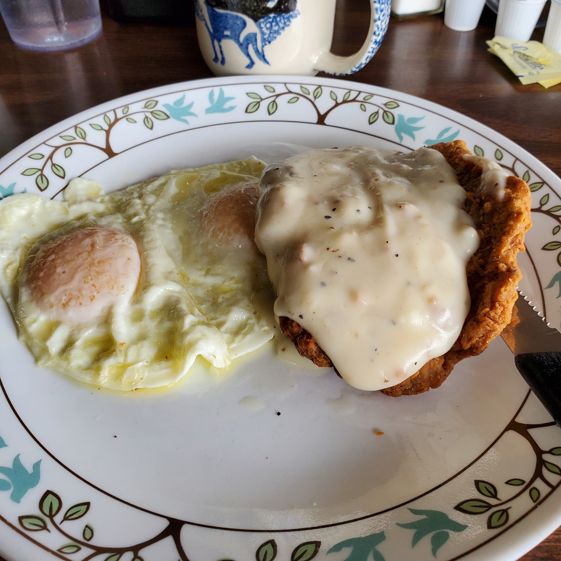 Stopped here passing through from Divide. The food was.. eh. Our order: My husband: chicken sandwich with fries Me: breakfast burrito with half sausage gravy, half green chili, and a buttermilk pancake.
