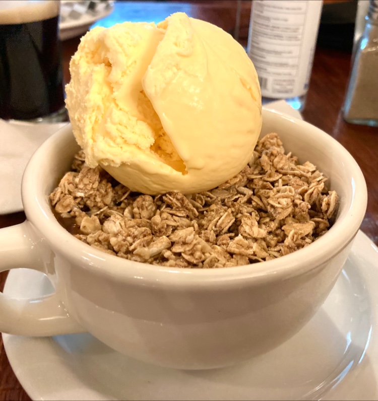 Repurposed from a bank, this Irish pub-style restaurant does not just offer a meal. It offers an experience with live music on Thursdays and an upcoming St. Patrick's Day event. There is covered outdoor seating next to heaters but indoor seating is where you would get front-row seats to the band playing familiar favorites, like Danny Boy. You seat yourself and can choose between tables and sitting at the bar. Staff are friendly and even recognize regulars to Father Paddy's. We ordered the cajun prime rib bites as an appetizer and, oh boy, was it tender and flavorful. Bathed in olive oil with a delicate mix of vinegar and spices, juicy cuts of beef were complemented with the bite, zestiness of the horseradish cream served on the side. For our main dishes, we enjoyed the fish and chips and the shepherd's pie (with soda bread). Potatoes are transformed into tasty sides here; the fries had a housemade flavor and the mashed potatoes embracing the shepherd's pie were fluffy. Although the meat and vegetable mix in the shepherd's pie came together into what can be truly defined as comfort food, we were surprised that butter was not included on top. Our desert came highly recommended by our waitress: the fireball apple crisp. With the scoop of vanilla ice cream adding creaminess, the sweetness of syrupy apples is buried under the treasure of rolled oats and granola. The combination of crunch and softness worked well.