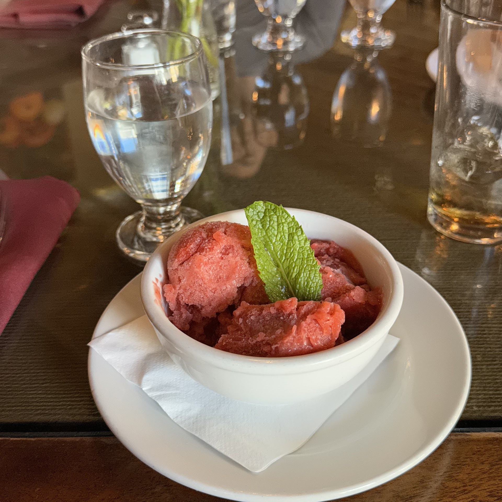 This restaurant has two sides one near the bar area and the other side near the kitchen area. The kitchen area has a nicer more elegant atmosphere while the other side is your typical restaurant! The staff was very accommodating and didn’t mind that we took a long time to view the menu. They also constantly refilled our water and soda when they passed by and collected our dishes after we were done using them. We chose to sit closer to the kitchen in the fancy area! They have amazing cocktails, I tried the watermelon mint lemon drop and it was fantastic. It came with a piece of fresh watermelon and the cocktail doubled as a partial donation to a cause. This is on their menu which I thought was super cool. As for the food options, it was pretty diverse. Most of the salads come with dressing and all the usual stuff but you can add proteins to it as well. I had the watermelon beet salad to go with my cocktail and it paired nicely especially for the heat wave that was going on. The salad came with greens, cheese, candied walnuts and pickled beets. It was fantastic and light on the stomach. The ingredients were very fresh. My fiance had the crab cakes and they were delish! The steak was cooked nicely and the buffalo wing appetizer was a great shareable. For dessert we had strawberry rhubarb sorbet which was refreshing and perfectly tangy. A great balance! We also had the peach cobbler and it was gone within seconds because of how tasty it was, it was definitely a favorite! I recommend this if you’re in the area and it’s in downtown woodland so you can walk around all the cool antique shops after dinner! They also have a really cool notebook you can sign when paying! Such a cool and...