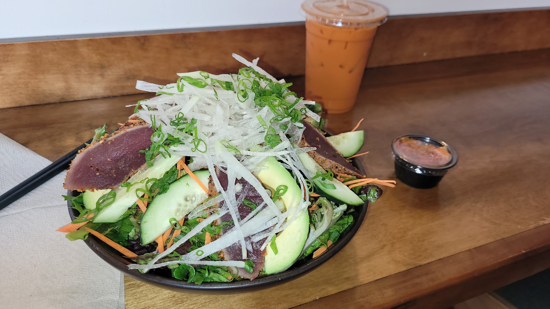 I eat here every few weeks. Sometimes more. It's my favorite place in Woodland. I love the back story about the owners: a couple merging their names to create "Kuji," and working hard to bring their favorites to us. I'm eternally grateful; the food is delicious. The kimchi is homemade, so is the Sriracha-type hot sauce. I get extra kimchi with every order. They also have the most delicious Korean pickles. My favorites are the pork belly salad, stone pot bimimbop, the K-chicken sandwich with extra aioli, and now, the tataki seared tuna salad. SoooOOooo goooOOood. It had slightly spicy, thinly sliced tuna that had been sliced after searing. There was super flavorful dressing that didn't drown the salad. Shaved (I think) jicama, or maybe it was that Japanese white radish. Avocado, and of course greens. I can't say it enough, how delicious it was. Crunchy and crispy, soft and smooth, savory and slightly spicy, fresh and yummy! They have a couple different flavor teas and boba. The berry tea is pretty good, but I always get Thai tea, no boba. I don't think I've ever had something I don't like. I always want to try something new when i look at the menu, but I just love my favorites! Most of the time, I feel like the portion sizes are perfect! No box to bring home, no hassle. Every bite super satisfying. But, every once in a while, I want a bit more.. not because I'm still hungry, but because it's that good. Try this place, ask for the pork belly salad or whatever you want, you won't be disappointed. Anyway, thank you, Kuji, I'm so glad I found you. your...