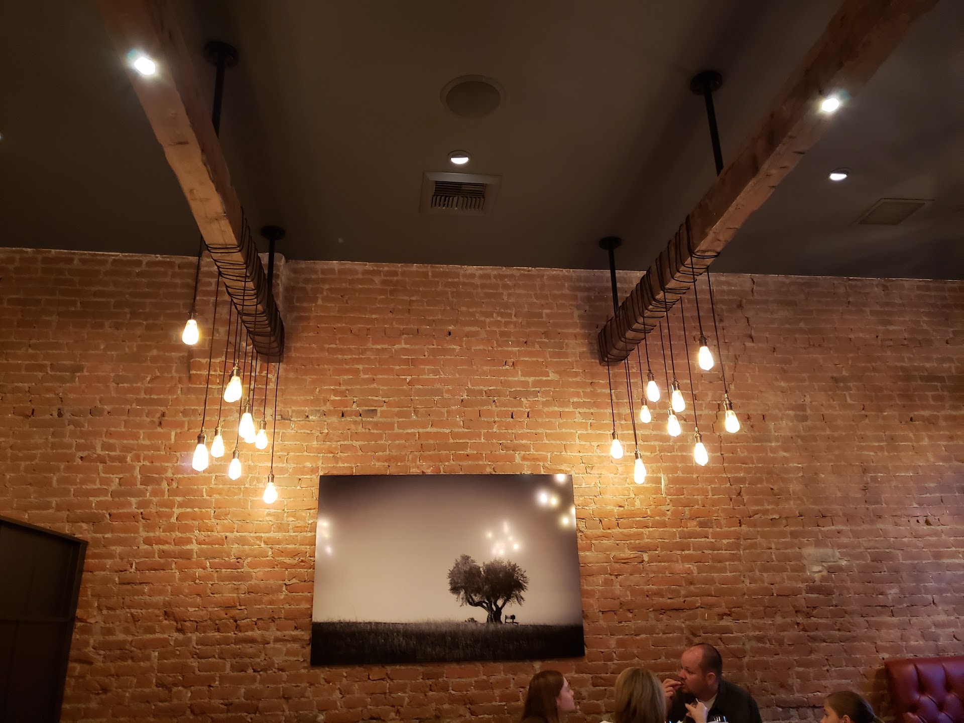 Absolutely wonderful experience here. Came with my partner to have dinner with her parents and had a great time. I work in food service so I have high expectations but I was truly happy with everything. The ambiance was wonderful. Elegant lighting tucked and strung across old timber hanging from the high ceilings, creating a warm glow off the old brick walls. The extra tall booths gave us a real sense of privacy as we dined. The service was great, our server was prompt and friendly and she new the menu well, gladly answering any questions we had. All the food was delicious, we shared some appetizers that were presented well and perfectly portioned. For my entree I got the fresh tuna special with a black pepper crust and cooked to medium rare with spaghetti squash and rice. It was perfect. Everyone else also loved their dishes and we all left extremely happy. It was a great experience and I'd definitely come back again. In fact we did. The next day we grabbed another app to go while we were in the neighborhood. Couldn't resist the opportunity to try their chicken and waffles. So delicious I'm willing to let slide the mix-up of them losing the order and finding it was sitting ready all along. All in all I'd recommend this place and will definitely be coming back if I find myself in...