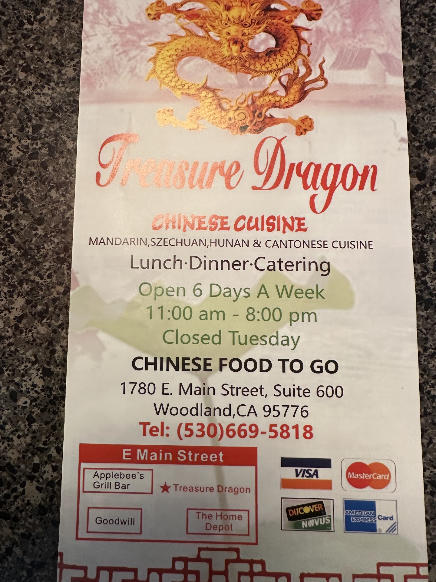 Ate here at the newer location since 20 years ago. Went because of the reviews since Woodland Asian food is really limited. Panda Express chain is really most consistent. Now family owned Treasure Dragon Main Street Woodland has the top spot. We has the two most mentioned signature dishes, Honey Walnut Shrimp and Orange Chicken dinner combo. There were huge portions, freshly cooked and tasted delicious. Our tab was $70 including food, beer/wine, and tip. There was enough food left over for another meal at home I can't figure out how they can serve such portions and still make money. My favorite Chinese food, though, is still the main restaurant at Cache Creek Casino that still has original recipes from Frank Fats Sacramento. I highly recommend both for residents and travelers.