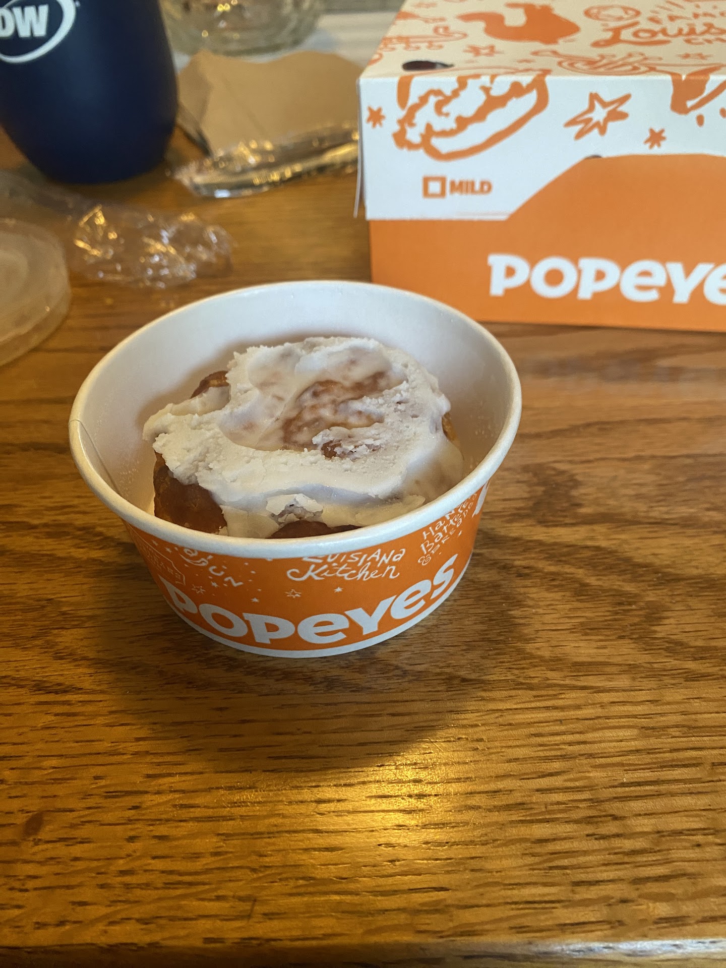 To put the icing on the cake my order was crap. I ordered popcorn shrimp. There wasn't anything shrimp! It was just peices of rock hard breading. I used to have Popeyes by my old apartment in mason and they were delicious! I was shocked by the difference. It was like a completely different restaurant, the standards were no where to be found. In comparison it was the equivalent of eating the leftovers out of the dumpster in the back. Not...