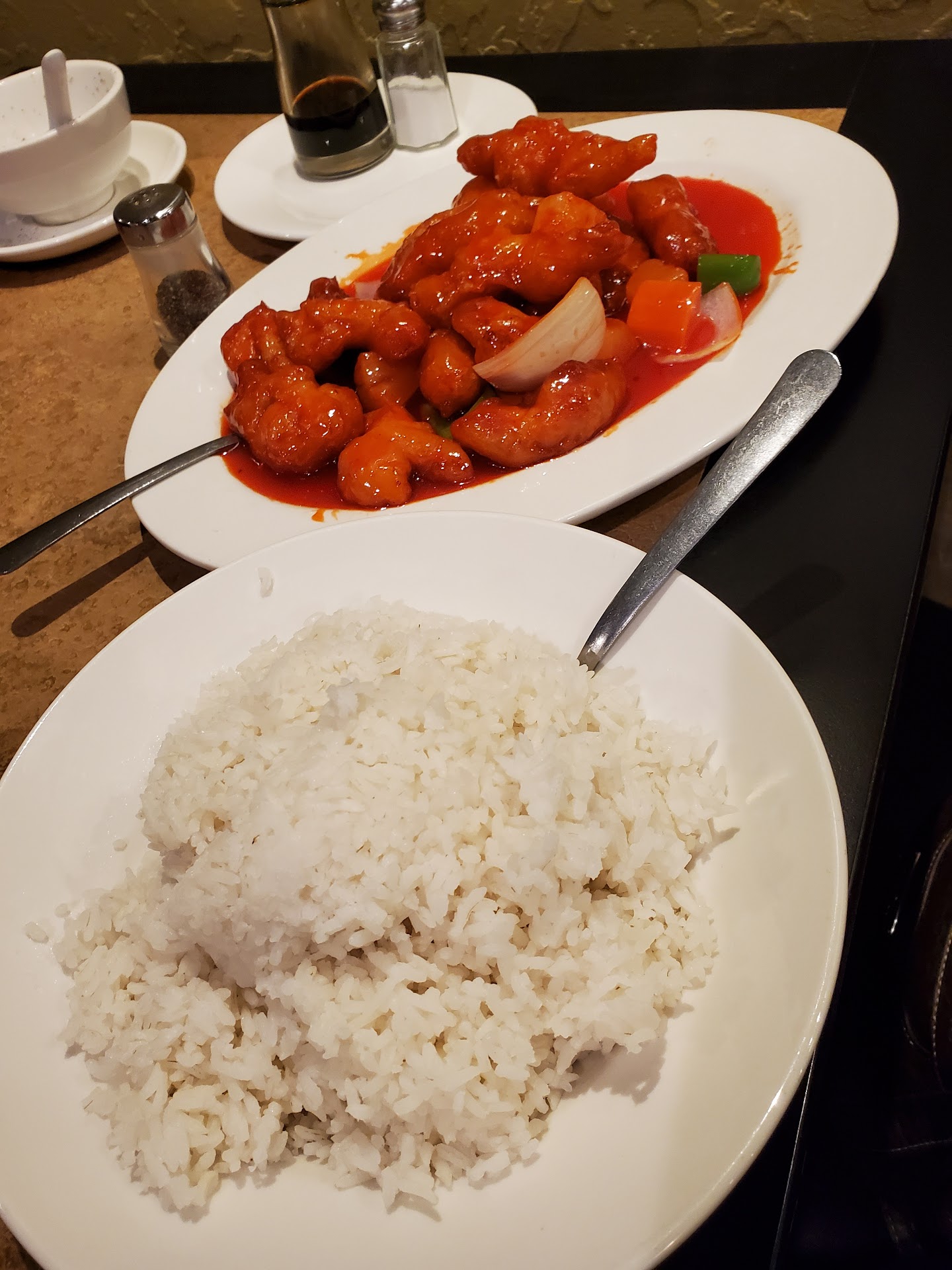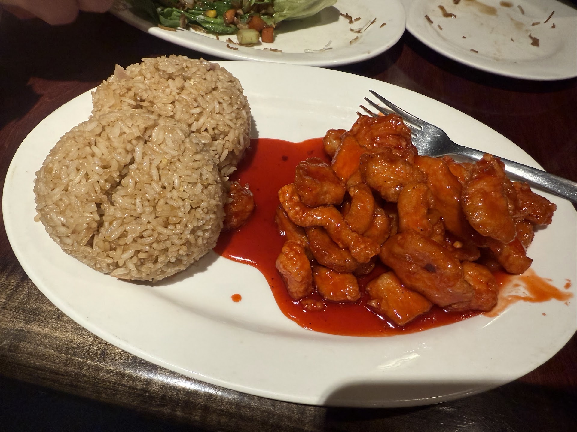 We ordered 3 different chicken entrees. Tangerine, General Tsao, and Sweet and Sour chicken. We couldn't figure out which one was which. They tasted pretty much all the same. It was very good food.