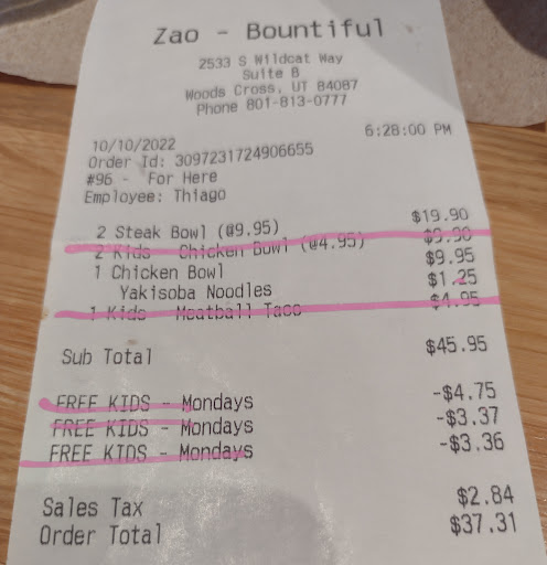 Ā Ā Ā Read moreI have been coming to Zao since they opened. Iāve been to the one in Salt Lake and one in Farmington Several times over the years. When I first went to Bountiful location, it was good, good not as fresh as the others, but they served you a decent amount. I just went to one in Bountiful today. It was the worst, smallest serving of food I have ever received at a restaurant . I ordered the bowl. Theyāre barely put in 1/2 cup of rice. Like a tablespoon? if that, of the other ingredients. In the past the food was above the bowl and would hit the lid when they covered it. I felt cheated and will never go there again. Maybe thatās why there is never a line there. It used to be real busy. But it is not worth the money now. I would suggest you drive to Farmington or Salt lake just to get a decent serving? What happened here in Boy tofu location? I took photos so the owner could see, but I donāt see a place to...