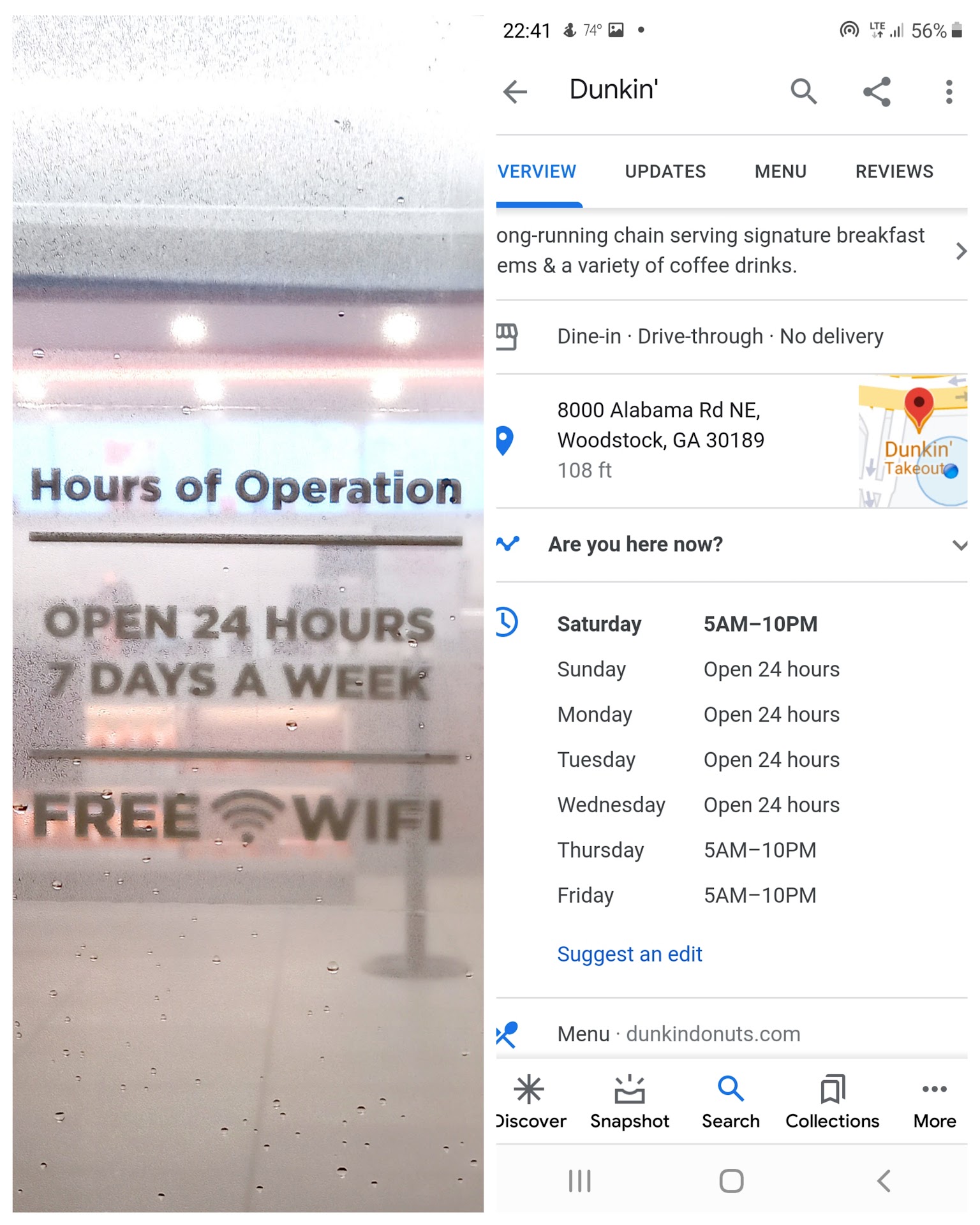 Ā Ā Ā Read moreAfter checking the hours posted on the door (open 24h 7 days a week) we walked in on a Saturday night at 10:15pm, placed an order and sat down to eat it At 10:30 an employee, Julie, came to tell us they were closing. I asked whether they weren't a 24h store. She said they were, but the dining room closes at night. I referred her to their posted hours and asked how late can one dine in. Her literal answer was "until the baker comes". After this a gentleman came and identified himself as the baker. He told me the hours on the door and on Google are incorrect and too hard to update correctly. They are in fact closing at 10pm every night upon his arrival and they are not a 24h location (?!). We're either in the dark ages or the twilight zone for this exchange to be considered acceptable! Level up guys, you're in the service industry. Meanwhile, I know we'll be taking our business to the renovated Dunkin near 575. Cannot continue to sponsor a place which obviously has no respect for themselves or for...