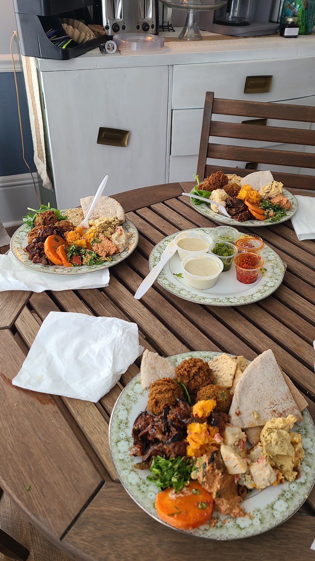 The food was fantastic! Fresh, healthy, and tasty. They offer a tasting of an item before you order if you're uncertain whether you'll like it. The Moroccan eggplant, carrots, hummus, and falafel were especially great. I'm a huge tabouleh/tabouli fan, but their's was not my favorite; same for the babaganoush as it lacked smokiness. That said, it's a personal flavor and texture preference and I'm sure it's good for others. It's a very small place; a few seats are available in the general common area of this building just outside the restaurant; I think it is primarily a take-away place. I will mention that the flow to the ordering/waiting/ serve/ self serve processes were a bit awkward. I'd mentored to the employee that we'd not been there before, but the person behind the counter expected us to know how they do things and didn't communicate their expectations until after they see you're not doing as they expect, e g., you don't wait for your hot drink but sit outside of the restaurant and they bring it to you, the rice which is on the salad menu and an item that we expected as part of the large sampler is actually not one of the salad options for the samplers but they provide an item that isn't even on the salad list (I had the employeepount out each item provided as they're kinda' mushed together; they bring your food to you but you get your own plasticware, napkins, cup. Don't get me wrong, it's obviously not hard, but if you don't know what's expected, it makes for service awkwardness. Street parking was fairly easy, but if it was busy on the square I expect parking would be difficult. Despite the few oddities, I'd definitely return and highly recommend for...