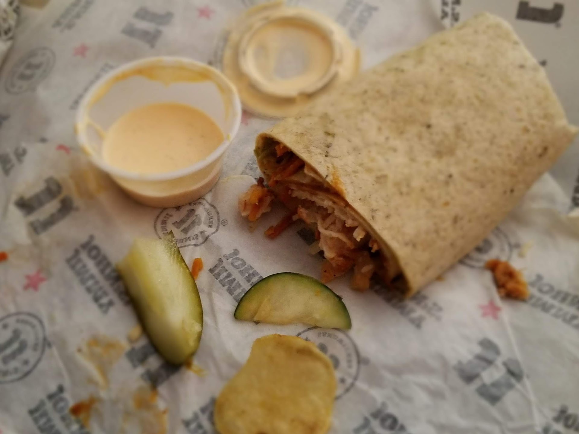 Josh at JJ's at #2230 in Woodstock, Georgia recommended a Thai Chicken Wrap. I called and ask for a recommendation because I have only tried two other sandwiches and after that I only eat the Gargantuan. Now this sandwich is big enough for two meals for myself. I ask if it was hot, I do not like really spicy food. He said no, so I trusted him. It did sound good. I will say that the Thai Chicken Wrap is my favorite sandwich/wrap of all times. It has a little spicy flavor but also a somewhat sweet flavor. It is definitely crunchy and that is a bonus for me. The chips, pickels and cookie is always good. I will add that it was delivered within probably 10 minutes after I ordered it and the driver was such a sweet young man. I had given special instructions and he followed it to a tee. I hope this wrap stays on your menu forever because I am a person of habit. I mean, like why change something that is almost perfect. I need to add a comment about the Kickin' Ranch sauce, it is the best. First time trying that also. Next time I will order two of those. Way to go Jimmy John's, you have added the best sandwich ever to my all time...