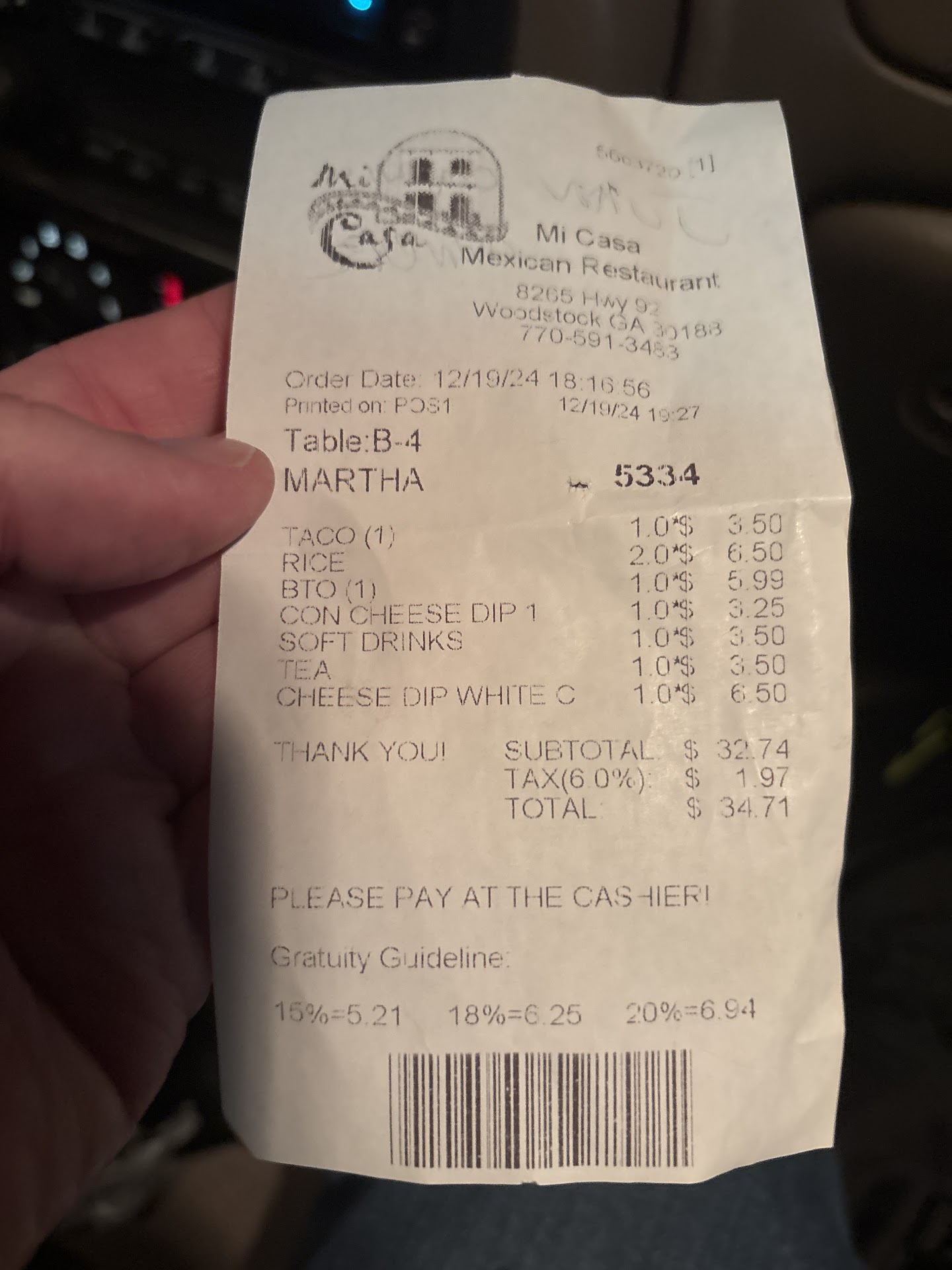 To start, we had family in town from Texas so we decided to pick up the meal and bring it home to eat so the kids could play. When we got it home, we were missing an entire entree, our veggie quesadilla didnât have cheese on it, we had a random chicken dish we didnât order but he charged us for, and the large cheese dip tasted like it was made from a powder (kind of like powdered mash potatoes) and had the worst texture. Our 5 kids took 1 bite and wouldnât eat it.