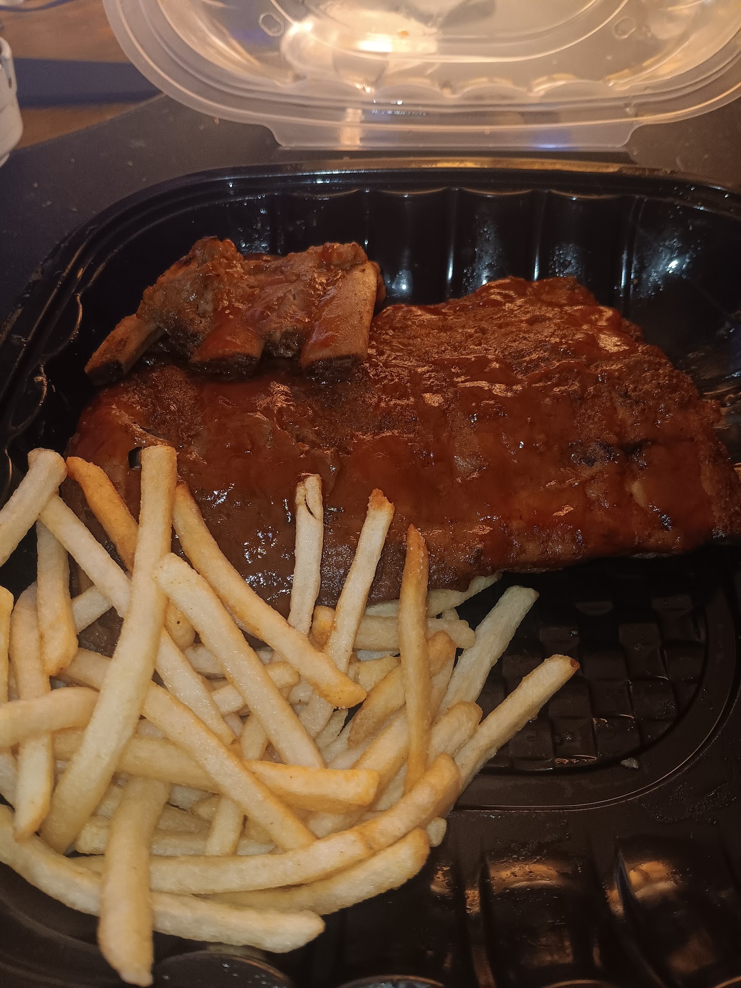 Read moreThis place had a very sports bar atmosphere. Which usually I am not a huge fan of. But the lay out and surrondings were quite relaxing and enjoyable. The menu was limited and they didn't have prime rib which is usually their Saturday special.😥 Hoping to one day try this. As this is the second time I have been here and this was not available. We had Liam as our server. He was very well mannered and personable. He listened well and was very respectful. Started off with the pickle chips. They arrived at the table piping hot. They were good but not anything special when it comes to pickle chips. I personally had the full slab of ribs. The barbecue sauce was tangy with a bit of a kick. The ribs were tender and fell right off the bone. They could have used a bit more of their BBQ sauce. Yet they were delicious all the same. I would recommend this place I had very...