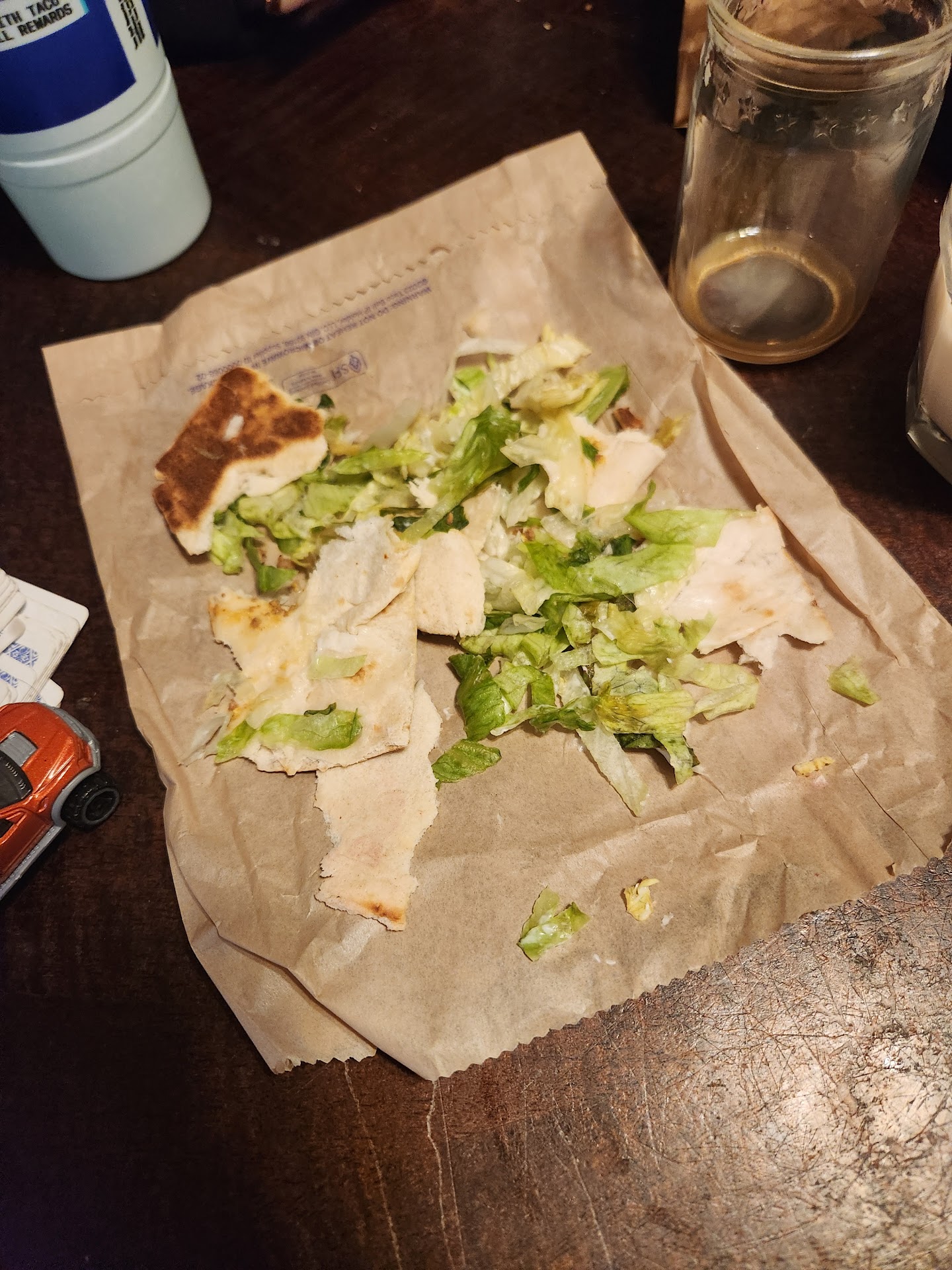 So, we pull around and wait for our food. After a few mins, the guy who took our payment brings our food. I ask him about sauces and he assured me that he put some of each in the bags. So, we take the food and drive home.