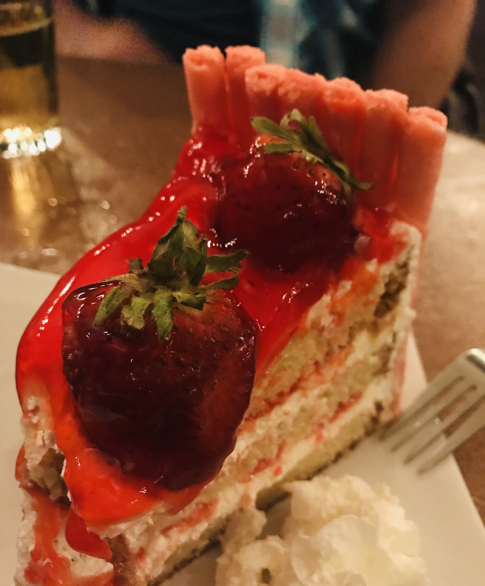 Now, about dessert...my favorite course!! See photo, nom! A few days prior I had popped-in to grab two pieces of tiramisu as a special birthday treat for a loved one. I called ahead and it was ready upon arrival; and also very yummy! When the owner saw me come in he said, “wait, I want you to try out special limoncello cake too on the house.” Okay! Later that evening when I finally tried it, WOW!! So, when we were having date night I knew I needed to check out other desserts...they’re made in-house not from a box or food distributor. As soon as the server said fresh strawberry cake (and said it was similar to the limoncello) I snapped up the chance to try it; despite my guests being skeptical. Everyone agreed hands down they would have never ordered it themselves BUT it was the best strawberry cake they’d had.