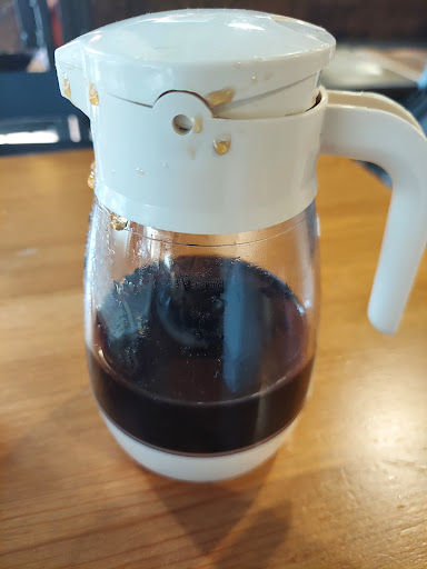 Read moreI really wanted to give this place a great review based on its rate score from previous guest. However, when you first walk in, this place has a down home, laid back vibe, and it was crowded and monothematic in its presence. (brown and more brown everywhere). I wasn't impressed at all. I was greeted by the hostess and was told it would be a few minutes before I could be seated. A minute or two later, the waitress took me to my table. The table and chairs look old and uninviting, and guess what...brown. Hmmm...I'm not getting a good vibe of this place at all. Remember when I stated it was crowded? Well, yep. I tolerated listening to several young children screaming and crying while I tried to give my order to the waitress. I know its not the childrens fault, but maybe they were just as unimpressed and stressed as I was. Anyway, I ordered the French Toast with chicken sausage, grits and scrambled eggs, and a coffee. The wait took about 10 minutes...okay not a big deal. But when I got my food, again, visually, I was not impressed. It was brown except for my yellow scrambled eggs. The presentation was boring, my food was luke warm, and my coffee was bitter. Oh and the syrup container was covered in syrup droplets...seriously? See the photo I posted. That's just nasty. Please wipe them off. I had no tolerance between hearing screaming children, cold food, and an uninterested waitress to complain and ask that my food be remade. People have a certain expectation of how they like their food served and how flavorful it is. Brown House Cafe is lacking in visual presentation, its environment, and bland food. If it improves on these three basic things, then it might get more stars and a more well-deserved review, but for today, they...