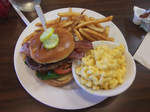 I ordered a bacon cheeseburger with fries and mac n cheese. I also ordered coffee, which was really good. The burger was a little greasy and the tomatoes were sliced a bit too thick. The onions had a weird spaghetti squash like consistency to them as well. Other than that I enjoyed the burger. The fries were bland and the mac n cheese was very ordinary. Not much to note there. For dessert I ordered a slice of chocolate peanut butter pie and some of their cinna-biscuits. The biscuits were warm and flakey, which was good, however I'm not a fan. The slice of pie was VERY sweet and I could not finish it.