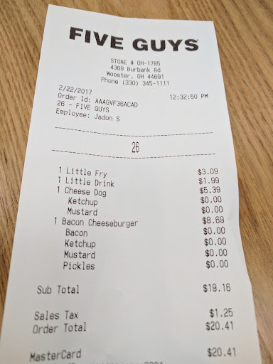 Read moreI go into this establishment today and place an order for fries and 2 milkshakes. I then asked if I can have just an empty cup so that I can place the 2 milkshakes I purchased into 1 cup instead of having to drink my milkshakes out of 2 separate cups ( because the milkshakes they have only come in 1 size and thats a small). The lady making my shakes(the manager) tells me I have to pay for the empty cup which i didn't understand why since i just spent $20 on fries and 2 small shakes. But I went ahead and was going to buy the cup, so i asked how much for the cup, she rings up a large drink and tells me i have to pay almost $4 for the EMPTY CUP!!!. I then say no,I don't want a drink, I just wanted an empty cup to place the 2 milkshakes I bought into 1 cup. I have done this multiple times because Im always ordering 5 guys food and shakes and always spend over 50.00. But again thats the Cleveland location who truly practices customer service. But to try and charge me almost $4 for an empty cup is ridiculous. I don't understand why it's so hard to please a customers simple request, all i wanted was to place 2 shakes into 1 cup. I can spend my money here but can't even get a empty cup?? Who charges a customer $4 for an empty cup. That is ridiculous. I'm very disappointed in the Wooster Ohio location. They have definitely lost a fan of Five Guys, and a...