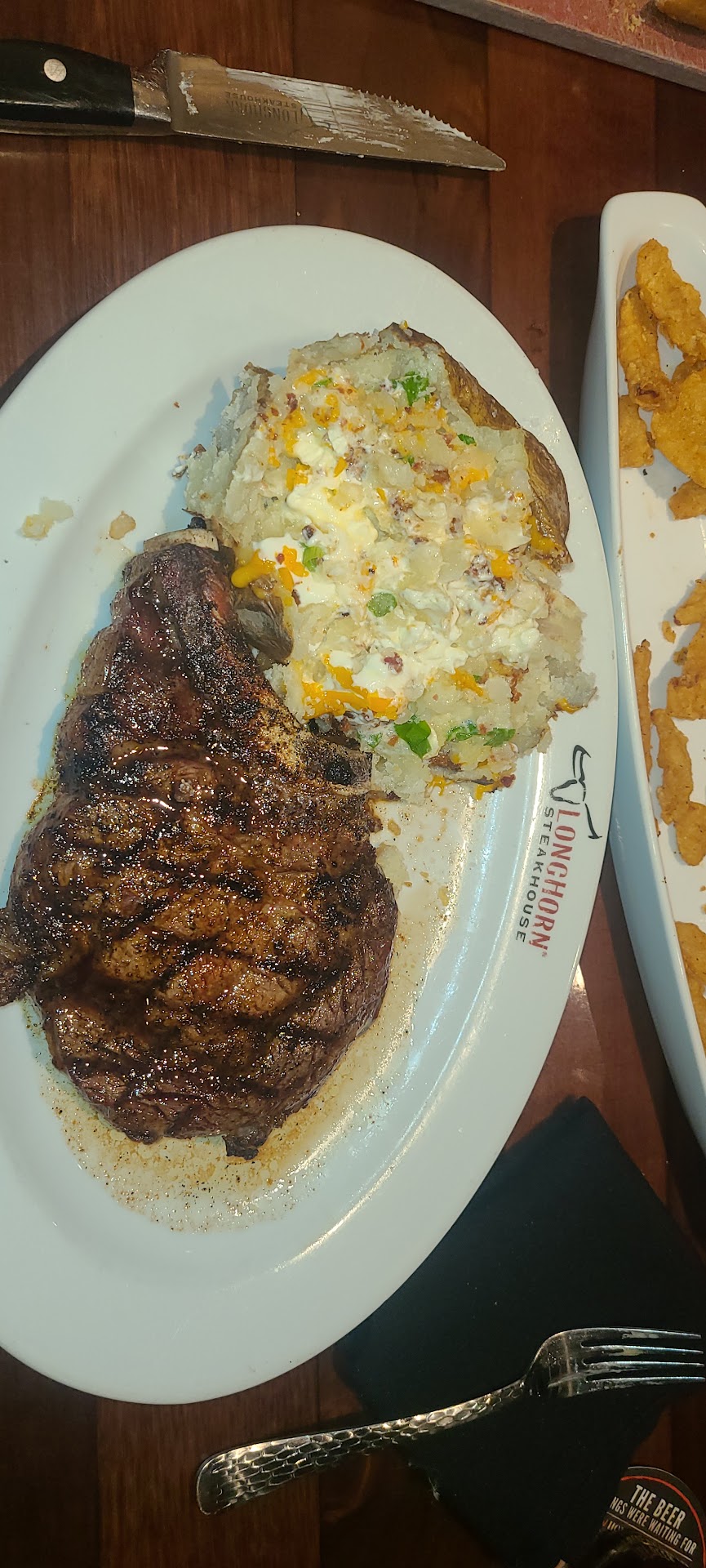 My wife and I decided to split their big porterhouse steak, The Longhorn (22oz!), we would have ordered an appetizer but a hot, soft, and delicious loaf of table bread arrived before we ordered so that became the app.