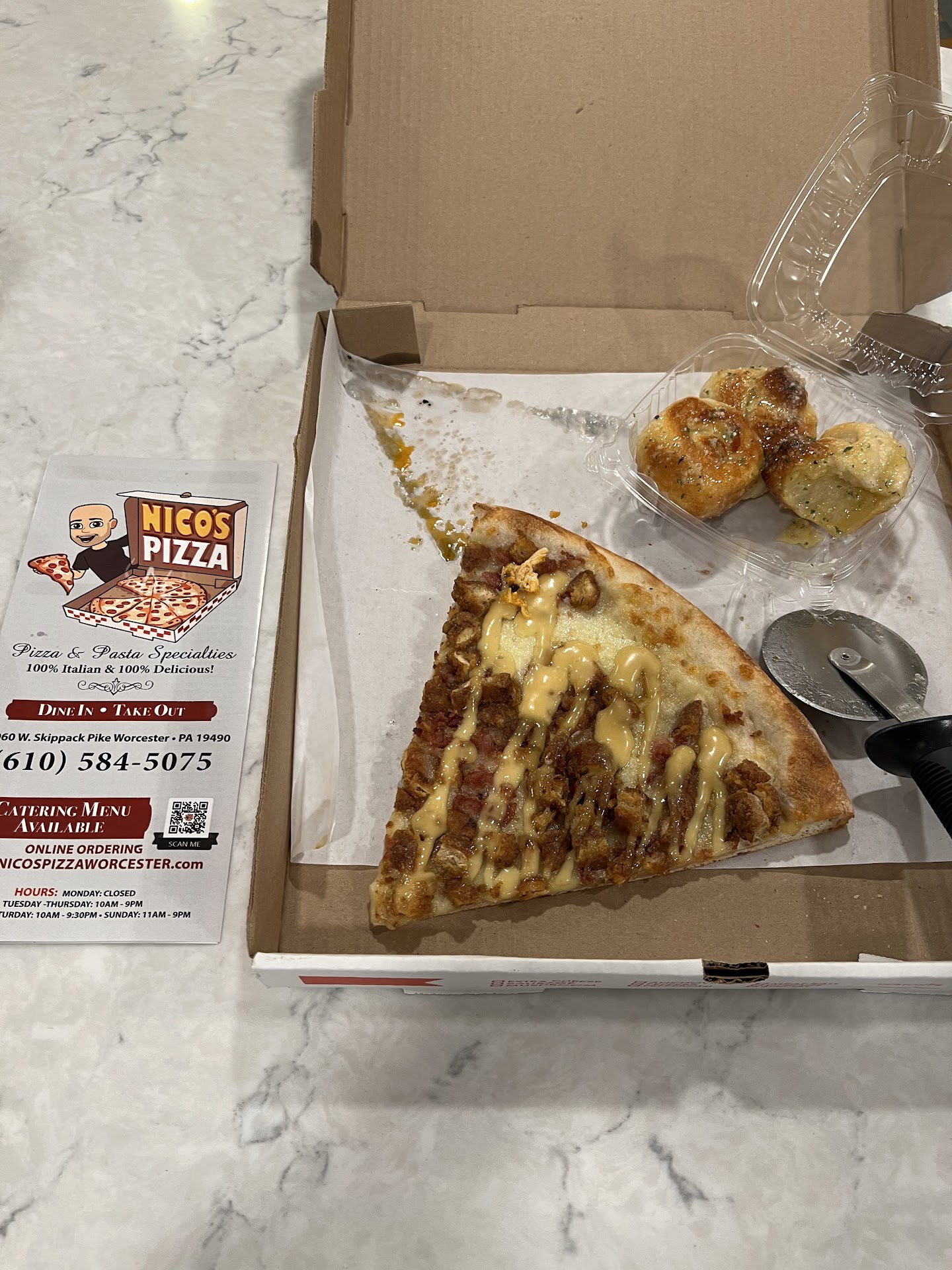 Tough location to open a pizza shop. There's Padrino's, Giuseppe's, and Frank's in Lansdale, all of which are much better than the pizza we got from Nico's. The crust was flavorless. The sauce wasn't great, but at least it wasn't sweet. They included a container with a few garlic knots, but they were undercooked inside, drenched in what tasted like plastic movie theater butter, and had little garlic. We each tried one and didn't bother with the last one.